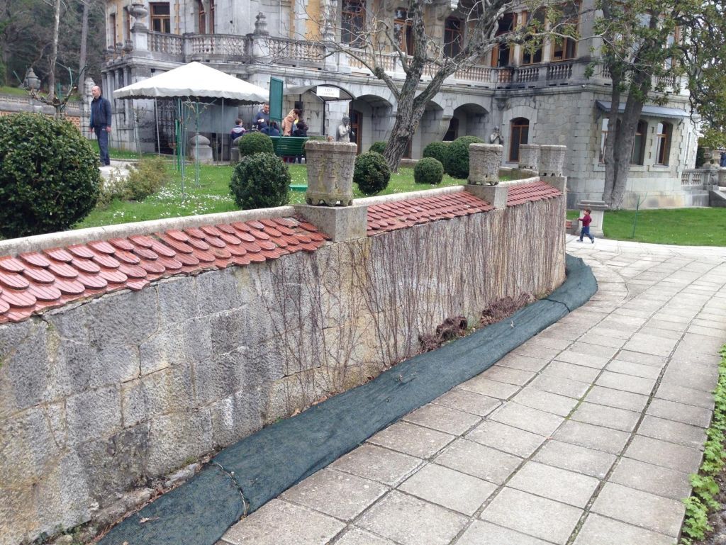 Предмет охраны объекта культурного наследия федерального значения «Комплекс сооружений дворца Александра III, 1880-1902 годы»: «Подпорная стена с вазами и тумбой», расположенного по адресу: Республика Крым, городской округ Ялта, пгт.Массандра, ул.Симферопольское шоссе, 13.Градостроительные характеристики.Местоположение: объект расположен в северо-восточной части современной территории дворцово-паркового ансамбля в Верхней Массандре, к северо-западу от дворца.Охраняется: - историческое местоположение памятника и его композиционная роль в ансамбле и окружающей ландшафтно-градостроительной ситуации.Секторы и направления видовых раскрытий, визуальные связи памятника.Охраняется: - сохранившиеся исторические видовые/визуальные раскрытия на объект культурного наследия; визуальные связи памятника на начало ХХ века.Архитектурно-композиционные характеристики и элементы.Объемно-пространственная структура; исторические габариты.Объемно-пространственная композиция сооружения на начало XX века: стенообразное сооружение сложной в плане конфигурации, огибающее верхнюю террасу парадной части парка с северо-запада, с тремя лестницами, и верхней замощённой метлахской плиткой площадкой у северо-западного угла дворца; с тумбами (5 штук); односкатное (на протяжении большей части стены, на западном конце – двускатное) завершение подпорной стены покрыто черепицей, между участками которой на низких пьедесталах установлены вазы; верхняя площадка с юга ограждена балюстрадой, с севера - низким парапетом-бордюром.Исторические габариты сооружения.Охраняется: - историческая конфигурация плана и объёмно композиционное решение, исторические габариты.Композиция и архитектурно-художественное оформление.Композиция и оформление на начало XX века, в том числе: месторасположение и форма лестниц, тумб, ваз; общие характеристики декоративного оформления сооружения на начало XX века, включая характеристики утраченных элементов.Сложная несимметричная композиция, образуемая подпорной стеной, тремя лестницами, покрытой метлахской плиткой верхней площадкой, вазами и тумбами; роль композиционного центра отчасти выполняет средняя лестница. Элементы композиции, их сохранившиеся элементы, характеристики, параметры и оформление, в том числе:- средняя лестница - проходящая параллельно плоскости подпорной стены, с широкими низкими ступенями; пониженное ограждение противоположной от подпорной стены южной части лестницы выполнено в форме ступенчатых стенок с двускатным (с ребром между скатами) завершением и также, как и основной объём подпорной стены, накрыто кровлей из черепицы;- западная лестница - проходящая параллельно плоскости подпорной стены у её западной оконечности, соединяет верхнюю террасу парка с проездом к зданию машинного отделения;- северо-восточная лестница - проходящая перпендикулярно плоскости подпорной стены у её восточной оконечности, соединяет верхнюю площадку средней лестницы с замощённой метлахской плиткой площадкой у калитки ограды дворца;- указанная выше площадка у калитки ограды дворца, ограждённая с северо-востока бордюром, с юго-востока – балюстрадой;- западная тумба – в западной оконечности подпорной стены; поверхности обработаны филенками, сухариками и карнизами с разуклонкой вверху, место перехода тумбы в подпор