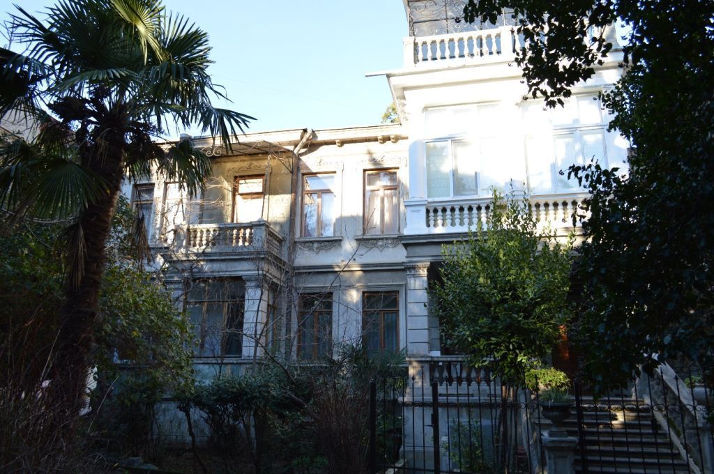 Нематериальные особенности объекта культурного наследияИсторико-художественная ценность: здание выполнено в эклектичных формах с элементами неогреческого стиля.Материальные особенности объекта культурного наследияГрадостроительные характеристикиМестоположение: здание расположено в г. Ялта с отступом в глубину дворовой территории ул. Пушкинской.Охраняется местоположение в структуре застройки г. Ялты.Архитектурные и конструктивные характеристикиОбъемно-пространственная композиция: двухэтажный объем с цокольным этажом, сложной конфигурации в плане.Охраняются: конфигурация в плане, габариты, количество этажей, высотные отметки по венчающим карнизам.Крыша: скатная, сложной конфигурации. Кровля – металлическая, фальцевая. Элементы водоотведения – из оцинкованного металла.Охраняются: конфигурация (форма) крыши, высотные отметки по конькам, тип материала элементов водоотведения, тип материала и техника исполнения кровли на начало XX века.Южный фасад: южный фасад ассиметричный с боковыми крыльями и ризалитом, смещенным вправо относительно центральной оси.Охраняется композиция фасада.Оконные и дверные проемы прямоугольной конфигурации.Охраняются: историческое местоположение, форма, размер и количество оконных и дверных проемов.Оконные проемы обрамлены профилированным рамочным наличником с подоконником (сдвоенные проемы имеют общее обрамление). Над наличником находится лепная композиция, состоящая из маскарона в виде женской головы, по бокам от которого расположены валюты, декорированные растительными элементами. Под подоконником находится лепная композиция, состоящая из картуша, по бокам от которого расположены валюты, декорированные растительными и цветочными элементами. Простенки сдвоенных оконных проемов декорированы лепниной из растительных и цветочных элементов. По бокам оконных проемов первого этажа находятся подоконные консоли, декорированные листом аканта.Охраняются: историческое местоположение, форма, габариты, тип материала декоративного лепного обрамления оконных проемов.Боковые крылья в уровне первого этажа выполнены в виде террас (аналогичная терраса примыкает к первому этажу ризалита), образованных рустованными колоннами и полуколоннами прямоугольного сечения на базах со стилизованными капителями и ограждением в виде фигурных балясин. Террасы боковых крыльев в уровне второго этажа образованы колоннами и полуколоннами круглого сечения на базах с ионическими капителями и ограждением в виде фигурных балясин. Восточное крыло завершается открытойтеррасой с ограждением в виде фигурных балясин, расположенных между прямоугольными тумбами. Аналогично оформлен балкон над террасой ризалита.Охраняются: историческое местоположение, форма, габариты террас и балкона; историческое местоположение, форма, тип материала декоративных элементов.Элементы горизонтального членения представлены профилированными цокольным, межэтажным и венчающим карнизами, а также профилированной тягой, проходящей над оконными проемами второго этажа. Венчающий карниз декорирован кронштейнами с листом аканта.Охраняются: историческое местоположение, форма, габариты, тип материала элементов горизонтального членения.Виды отделки фасадной поверхности: стены – штукатурка по каменной кладке. Охраняется ха
