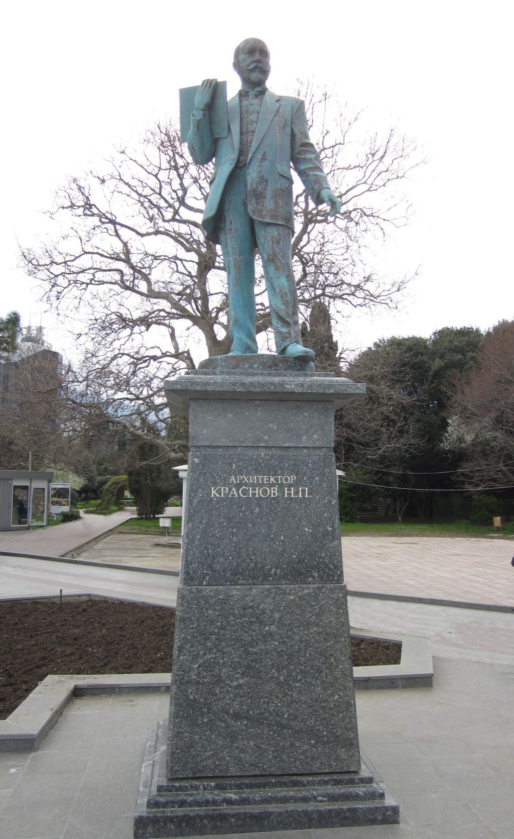Нематериальные особенности объекта культурного наследияДатировка: дата создания памятника – 2014 год.Историко-художественная ценность: памятник выполнен по индивидуальному проекту, является авторской работой.Авторство: авторы: скульптор Никитин С. А., архитектор Приступа В. И., художник Жерибор В. И.Материальные особенности объекта культурного наследияМестоположение: памятник расположен на пересечении набережной имени В.И. Ленина и улицы Екатерининская. Охраняется местоположение.Скульптура: скульптурное изображение Н.П. Краснова в полный рост выполнено из бронзы. Скульптура находится на небольшой круглой подставке, также выполненной из бронзы. Правая рука согнута в локте. В ней Н.П. Краснов держит папку. Левая рука расслаблена и отодвинута в сторону. Взгляд устремлен вдаль. Левая нога выдвинута вперед. Н.П. Краснов одет в брюки, пиджак, рубашку с жилетом и галстуком. На тыльной грани подставки авторская подпись прорезью: «СЕРГЕЙ НИКИТИН 2014». Охраняются: местоположение, габариты, материал (бронза), техника исполнения и художественный образ скульптуры.Постамент: постамент под скульптурой выполнен из гранита, прямоугольный, сужающийся к верху. Нижняя часть – трехступенчатая. В верхней части проходит выступающий карниз. С лицевой стороны высечен текст: «АРХИТЕКТОР / КРАСНОВ Н.П.». С тыльной стороны высечен текст: «скульптор / Никитин С. / архитектор / Приступа В. / художник / Жерибор В.».Охраняются: местоположение, конфигурация, габариты, материал (гранит) постамента, содержание надписей.Подиум: памятник расположен на подиуме сложной конфигурации, облицованном гранитной плиткой. С юго-западной стороны – клумба. Охраняются: местоположение, конфигурация, габариты подиума, тип материала (гранит) облицовки.Предмет охраны может конкретизироваться при изменении степени исследованности памятника.