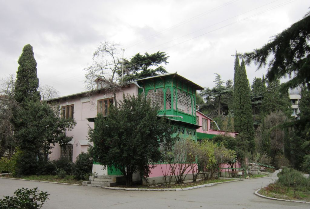 Нематериальные особенности объекта культурного наследия Датировка: конец XIX века - начало XX века.Историко-художественная ценность: здание построено в стиле южного модерна с использованием деревянного ажурного зодчества.Градостроительная ценность: своей выразительностью архитектурного стиля и планировочной целостностью сформированной городской структуры ставит здание в ряд ценных сооружений архитектурно-градостроительной значимости. Объект представляет градостроительную ценность, как элемент исторической застройки ул. Ломоноса в г. Ялта. Является градоформирующим акцентным объемно-пространственным зданием.Материальные особенности объекта культурного наследия: Градостроительные характеристики Местоположение здания: находится в западной части г. Ялты на исторической ул. Ломоносова (ранее Ломоносовский бульвар), на левом берегу реки Учан-Су (Водопадной). Здание расположено с отступом от «красной» линии застройки. Главный фасад ориентирован на восток на сквер им. Ломоносова. Расположено уединенно в окружении густого озеленения высокорослых кипарисов.Охраняется местоположение. Силуэт, габариты: здание социального назначения, каменное, 2-х этажное без подвала, сложное Г-образное в плане (габаритные размеры 8,2х9,8х14,63(h) м). Крыша многоскатная, чердачная. Состоит из нескольких разновысотных объемов, примыкающих друг к другу. Высота потолков 1-го этажа от 2,7 м до 4,5 м; высота потолков 2-го этажа – от 2,3 м до 2,8 м. Объем здания (в соответствии с паспортом БТИ) составляет 2048 м3. По периметру прямоугольного участка располагаются строения, образующие замкнутый прямоугольник с внутренним двориком. Въезд во двор осуществляется с набережной. Охраняются силуэт и габариты (после проведения реставрационных работ и восстановления исторического облика). Архитектурные и конструктивные характеристики:Объемно-пространственная композиция: здание социального назначения, каменное, 2-х этажное без подвала, сложное Г-образное в плане. Охраняется форма в плане на период строительства, этажность, высотные отметки по свесу кровли и конькам кровли.Крыша: многоскатная, конструкция крыши - деревянные наклонные стропила, по стропилам выполнена обрешетка. Покрытие кровли из кровельного железа с участками заменной кровли на профнастил и оцинкованную сталь. В крыше устроены слуховые окна. Существующие водосточные желоба и трубы выполнены из оцинкованной стали. Охраняется местоположение, конфигурация (форма) крыши, габариты, высотные отметки по конька исторической части здания (после проведения реставрационных работ и восстановления исторического облика).Композиция и архитектурно-художественное оформление фасадов Главный вход расположен на южном фасаде, выполнен в виде выступающего вперед деревянного объема с остеклением, вход оборудован каменными ступенями, над которыми установлен двускатный козырек, декорированный коваными элементами. Оконные проемы сдержанно подчеркнуты легко выраженными сандриками нескольких конфигураций. Выделяет здание и подчеркивает южный колорит остекленные террасы на первом этаже восточного фасада, а так же небольшой деревянный балкон на втором этаже, украшенный декоративной резьбой по дереву в мавританском стиле. Стропильные балки основного прямоугольного объема и балки перекрытия веранд под свесами 