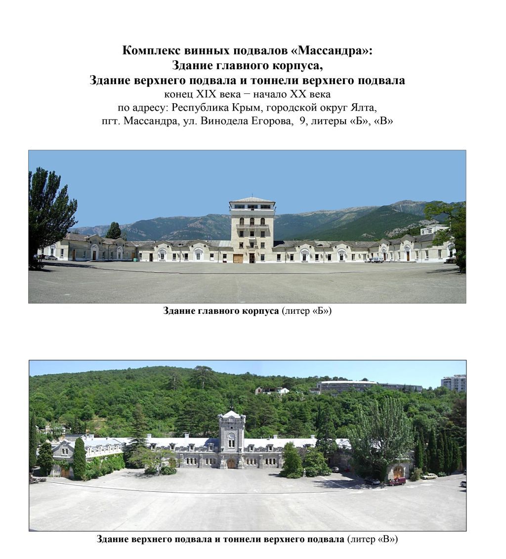 Предмет охраны объекта культурного наследия регионального значения «Комплекс винных подвалов «Массандра», конец XIX века - начало XX века», расположенного по адресу: Республика Крым, городской округ Ялта, пгт.Массандра, ул.Винодела Егорова, 9.Местоположение и градостроительная роль комплексаКомплекс расположен на южном берегу Крыма, в 4-х км от города Ялты в ущелье, ограниченном с северо-запада хребтом Ялтинской Яйлы, с северо-востока хребтом Никитинской Яйлы. Расположение на местности достаточно компактное и обособленное. Посадка зданий осуществлена на относительно ровной террасе горного ландшафта, при этом главные фасады зданий формируют площадь размером 90х90м, абсолютная отметка покрытия которой составляет 192,7м. Значительная часть комплекса является подземной, а основная надземная часть – одноэтажная. Возвышающимися частями памятника являются центральные башни главного корпуса и здания верхнего подвала. Охраняется местоположение, силуэт и габариты всех элементов комплекса.Здания и сооружения, участвующие в формировании композиционно-пространственной структуры комплекса- Здание главного корпуса, начало XX века;- Здание верхнего подвала и тоннели верхнего подвала, конец XIX века;- Бюст князя Л.С.Голицына (скульпторы К.Федчук, В.Дашкевич), 1996 год;- Бюст винодела А.А.Егорова, 1997 год,Охраняются все элементы комплекса, их местоположение, силуэт и габариты.Пространственно-планировочная структура комплексаСоотношение открытых и застроенных территорий: площадь, сформированная П-образным зданием главного корпуса с северо-запада, П-образным зданием верхнего подвала с юго-востока и бюстами князю Л.С.Голицыну и виноделу А.А.Егорову.Охраняется местоположение, силуэт и габариты зданий, бюстов, площади, соотношение открытых и застроенных территорий.Ландшафтные характеристики территории комплексаЗдания расположены на ровной террасе горного ландшафта. Основой местности является южный склон Никитской яйлы. К западу от главного корпуса расположена парковая зона с системой дорожек и посадок. На близлежащих к объекту территориях, свободных от застройки, преобладает естественная растительность, представленная сосной крымской. Естественная растительность Ялтинского горно-лесного природного заповедника и естественная растительность, сохранившаяся на участках, непригодных для застройки (на крутых склонах и в тальвегах оврагов, в долине реки Гувы) является неотъемлемой частью облика объекта и способствует поддержанию его исторической и архитектурной ценности. Древесно-кустарниковая растительность, покрывающая склоны и террасы, подчёркивает выразительный рельеф территории и усиливает ландшафтно-эстетические качества среды в зоне размещения объекта культурного наследия. Охраняются природные характеристики окружающих ландшафтов, являющихся фоном для восприятия объекта культурного наследия, планировка парковой зоны комплекса.Исторические видовые раскрытияВизуальное восприятие комплекса с прилегающих территорий ограниченное, что обусловлено рельефом местности.Комплекс имеет видовое раскрытие с территории к востоку от здания верхнего подвала.Наиболее полные виды обозрения осуществляются с центра главной площади, при этом здание верхнего подвала визуально проецируется на склон, преимущественно покрытый зеленой 