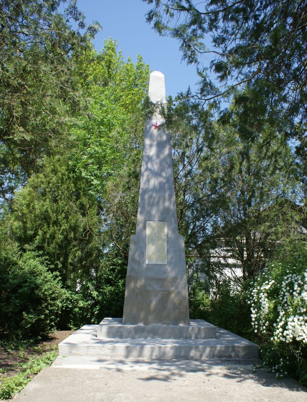 Предмет охраны объекта культурного наследия регионального значения «Памятный знак в честь воинов-односельчан, погибших в годы Великой Отечественной войны», 1941-1945 годы, 1967 год, расположенного по адресу: Республика Крым, Красногвардейский район, сельское поселение Петровское, с. Красная Поляна, у Дома культуры.Историко-художественная ценностьФорма и стилистическое решение, характерные для мемориальных сооружений 1970-х гг., относящихся к периоду Великой Отечественной войны.Мемориальное сооружениеОбелиск на постаменте.Охраняется: местоположение, композиционное решение памятника.Обелиск на постаментеОбелиск в форме усеченной четырехгранной пирамиды установлен на трехступенчатом постаменте (габаритные размеры ступеней (снизу вверх): 3,0х3,0х0,2(h) м, 2,05х1,45х0,20(h) м, 1,2х1,0х1,6(h) м). Элементы памятника выполнены из бетона, обелиск и верхняя ступень постамента покрыты лаком голубого цвета.В верхней части лицевой грани обелиска укреплена металлическая пятиконечная звезда красного цвета.Ниже, на постаменте, расположена мемориальная табличка из мрамора светлых оттенков (габаритные размеры: 0,4х0,8 м) с надписью: «ТОВАРИЩ! ЗАПОМНИ ИХ ИМЕНА», далее выполнен список фамилий и инициалов павших жителей села (см. Карточку объекта), ниже – «ВЕЧНАЯ СЛАВА ОДНОСЕЛЬЧАНАМ, ПАВШИМ В БОЯХ ЗА СВОБОДУ И НЕЗАВИСИМОСТЬ НАШЕЙ РОДИНЫ В ГОДЫ ВЕЛИКОЙ ОТЕЧЕСТВЕННОЙ ВОЙНЫ 1941-1945 гг.».Охраняется:- обелиск, постамент - местоположение, конфигурация, габариты, форма, тип материала; колористическое решение и тип отделки– после проведения комплексных научных исследований;- мемориальная табличка – местоположение, тип материала (мрамор светлых оттенков); содержание мемориальной надписи; список павших жителей села – с возможностью уточнения по данным архивов.- пятиконечная звезда - местоположение, тематика (сюжет), характер исполнения, тип материала (металл), цвет (красный).БлагоустройствоК постаменту памятника, с лицевой стороны, примыкает бетонная площадка, шириной 3,0 м. С тыльной и боковой сторон постамента расположен цветник.Охраняется:местоположение, конфигурация, композиция благоустройства территории в пределах площадки.Предмет охраны может уточняться после проведения комплексных научных исследований.