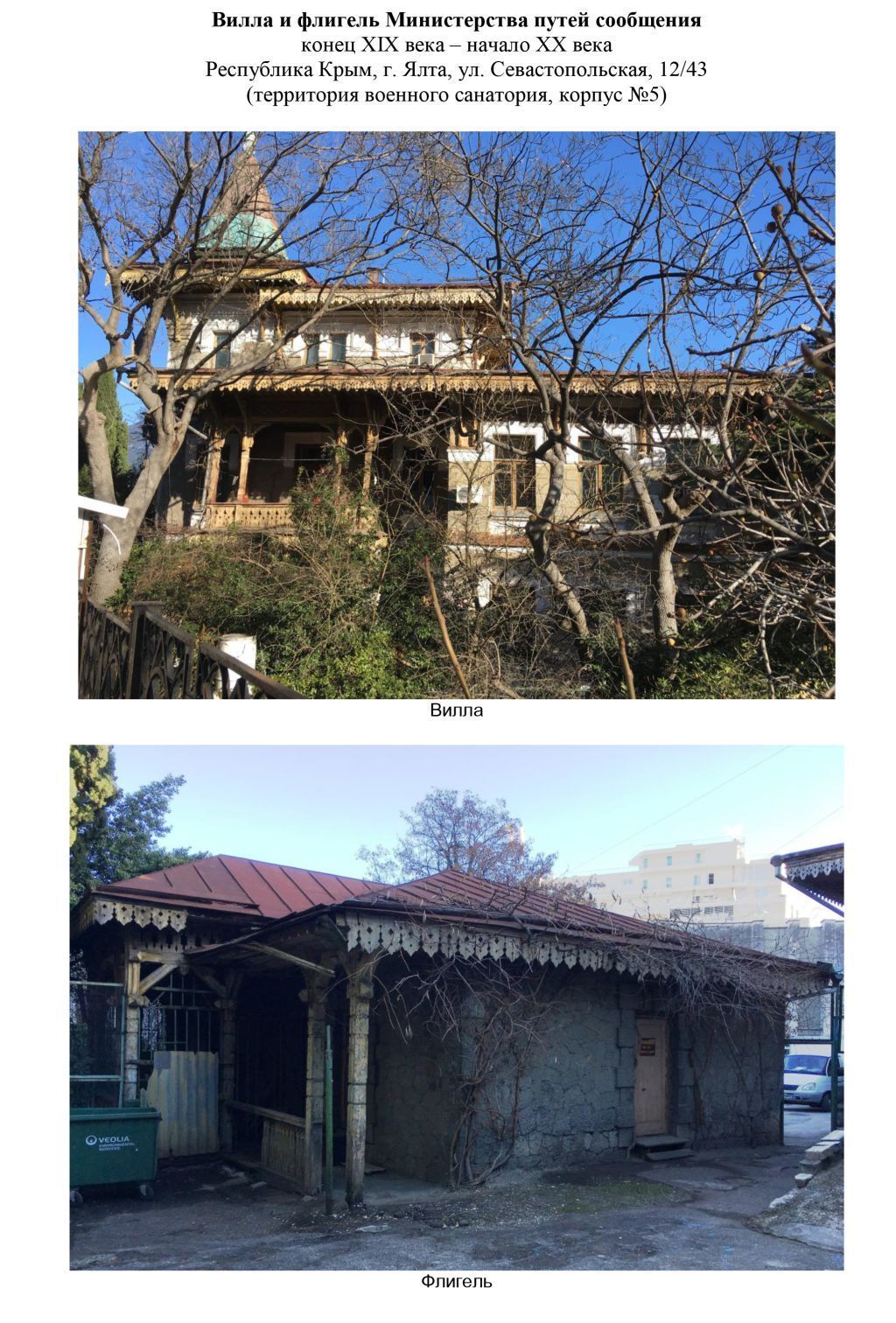 Предмет охраны объекта культурного наследия регионального значения«Вилла и флигель Министерства путей сообщения, конец XIX века - начало XX века»,по адресу: Республика Крым, г. Ялта, ул. Севастопольская, 12/43(территория военного санатория, корпус № 5)Датировка: время сдачи в эксплуатацию ориентировочно 1896 год.Историко-художественная ценность: объект представляет интерес архитектурно декоративными характеристиками. Свободное сочетание стилей, характерных для архитектуры рубежа XIX - начала XX веков, сформировало самобытный эклектический образ здания. Архитектор П. К. Теребенев возвел дом по канонам русско-византийского стиля, удачным образом дополнив проект элементами, характерными для мавританской школы зодчества.Градостроительная ценность: здание является доминантой в объемно-пространственной композиции и исторической линейно-пространственной структуре ул. Севастопольской. Главный фасад виллы Министерства путей сообщения (северо-западный) является логичным дополнением исторической линейно-пространственной структуры главной улицы Ялты Набережной им. Ленина.Авторство: предположительно здание построено по проекту ялтинского архитектора П.К.Теребенева.Местоположение здания: расположено в конце Набережной им. Ленина на пересечении ул. Володарского и ул. Коммунаров, на территории Военного санатория, в градостроительной среде исторической части города.Охраняется местоположение.Силуэт, габариты: силуэт с ул. Володарского - в виде прямоугольного параллелепипеда. Габариты литер «А» - 32,50 х 29,20 х 8,3 (Ь) м (до венчающего карниза).Охраняются силуэт и габариты.Силуэт с ул. Коммунаров - в виде прямоугольного параллелепипеда.литер «Д» - 10,49 х 13,88 х 3,5 (Ь) м (до венчающего карниза).Охраняются силуэт и габариты.Объемно-пространственная композиция: здание литер «А» двухэтажное с цокольным этажом и мезонином, сложное в плане, асимметричное, прямолинейной формы.Охраняются форма в плане, этажность.Здание литер «Д» одноэтажное прямоугольное в плане.Охраняются форма в плане, этажность.Крыша: крыша над зданием литер «А» многоуровневая.Охраняются конфигурация скатных кровель, высотные отметки коньков, угловой башни, выносов карнизов.Крыша над зданием литер «Д» - вальмовая.Охраняются конфигурация, высотные отметки коньков.Композиция и архитектурно-художественное оформление фасадов: охраняются местоположение, форма, размер и количество оконных и дверных проёмов, балконы, декоративное оформление фасадов, декоративное членение плоскости стен.Двери, окна: охраняются прямоугольная форма окон и дверей, их количество, размер, конфигурация; охраняются декоративное обрамление окон и дверей в виде профильных тяг, декоративных наличников, подоконных тяг и картин - охраняется форма, размер, конфигурация, материал. Деревянные резные колонны входа: охраняются местоположение, форма, размер, материал деревянных резных колонн, на которые опираются ажурные элементы открытых и застекленных балконов заднего и боковых фасадов, а также выносные элементы кровли.Междуэтажные и подкарнизные декоративные тяги: - охраняются местоположение, форма, размер, конфигурация, материал;Балконы: охраняются местоположение, форма, размеры, габариты, конфигурация (открытых) на северо-западном и юго-западном фасадах балконов, декоративных кронштейнов, ажурных ограждени