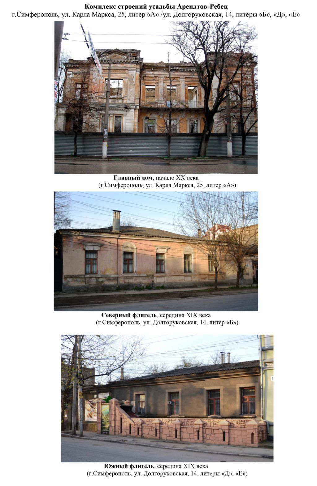 Предмет охраны объекта культурного наследия регионального значения «Комплекс строений усадьбы Арендтов-Ребец», середина XIX века, по адресу: Республика Крым, г.Симферополь, ул.Карла Маркса, 25, литер «А»/ ул.Долгоруковская, 14, литеры «Б», «Д», «Е».Нематериальные особенности объекта культурного наследияДатировка: дата строительства зданий – середина XIX–начало XX века.Мемориальная ценность: литер «Б» - дом, в котором предположительно с 1833 – по 1850-е годы жил знаменитый врач, основоположник отечественного планеризма Н.А.Арендт.Историко-художественная ценность: здание под литерой «А» по улице Карла Маркса, 25 построено в стиле неоклассицизма с элементами разностилевой модернистской архитектурной трактовки ордерной архитектуры - пилястр, наличников, фризов, карнизов и т.д.Градостроительная, ансамблевая ценность: здания рядовой застройки, расположенные вдоль главной планировочной оси г.Симферополя, являются одними из первых, сформировавших облик города середины XIX – начала XX века.Материальные особенности объекта культурного наследияПланировочные характеристикиМестоположение объекта: здания расположены в историческом центре г.Симферополя по улицам Карла Маркса и Долгоруковской.Тип планировки: квартальная планировка застройки.Объёмно-пространственные характеристикиОбъёмно-пространственное взаимодействие сооружений: здания высотой 1-2 этажа расположены на общей линии застройки квартала, ориентированы фасадами на ул. К.Маркса и ул. Долгоруковскую. Охраняется на начало ХХ века:– характер расположения зданий на общей линии застройки квартала;– объемные параметры здания под литерой «А» по ул. К. Маркса, 25.Пространственная организация ансамбля – не выявлена.Охраняется на начало ХХ века: – соотношение открытых и закрытых пространств вдоль ул. К. Маркса и Долгоруковской;– видовой фронт (бассейн видимости) на здание под литерой «А» со стороны ул. К. Маркса.Архитектурно-стилистические характеристикиОхраняется на начало ХХ века: – стилистические особенности фасадного декора здания по ул. К. Маркса, 25, литер «А».Ценные элементы застройки и благоустройстваЗастройка (здания и сооружения, малые формы, монументальная скульптура):1)Объект культурного наследия регионального значения «Главный дом комплекса строений усадьбы Арендтов-Ребец» (начало XX века), расположенный по адресу: Республика Крым, г. Симферополь, ул. К. Маркса, 25 литер «А».2)Объект культурного наследия регионального значения «Северный флигель комплекса строений усадьбы Арендтов-Ребец» (середина XIX века), расположенный по адресу: Республика Крым, г. Симферополь, ул. Долгоруковская, 14, литер «Б».3)Объект культурного наследия регионального значения «Южный флигель комплекса строений усадьбы Арендтов-Ребец» (середина XIX века), расположенный по адресу: Республика Крым, г. Симферополь, ул. Долгоруковская, 14, литеры «Д», «Е».Предмет охраны может конкретизироваться при изменении степени исследованности памятника.
