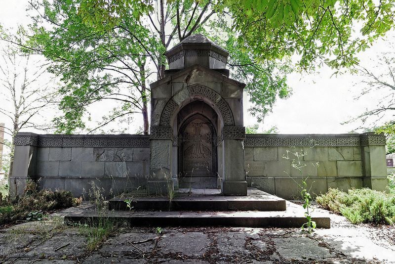 Нематериальные особенности объекта культурного наследияДатировка: конец XIX века – начало XX века.Историческая (мемориальная) ценность: склеп устроен над захоронением родственников выдающегося армянского композитора А.А. Спендиарова.Историческая функция: склеп.Материальные особенности объекта культурного наследияЗахоронения: - охраняются захоронения (могилы) в полном объеме.Градостроительные характеристикиМестоположение: на территории старого армянского кладбища. Охраняется местоположение.Габариты, силуэт: - охраняются: габариты и силуэт на конец XIX века – начало XX века.Архитектурные и конструктивные характеристикиОбъемно-пространственная композиция: мемориал состоит из трех основных частей: 1) прямоугольного в плане каменного подиума, 2) каменной мемориальной стены, которая огибает подиум с востока и завершается большого выноса тумбами, выступающими на южном и северном флангах, 3) каменного балдахина (квадратного в плане) на четырех опорах, увенчанного восьмигранным барабаном и пирамидальным шатром. Охраняется объемно-пространственная композиция: конфигурация в плане, высотные отметки по венчающим карнизам.Крыша: крыша в форме пирамидального шатра, каменная. Охраняются: конфигурация (форма) крыши, высотные отметки по конькам, материал кровли. Утраченные элементы (каменный крест) охраняются после проведения реставрационных работ и восстановления по архивным материалам.Композиция и архитектурно-художественное оформление фасадов: опоры балдахина формируют стрельчатую арку с двускатным верхом. Строение имеет три стрельчатых проема и увенчано низким восьмигранным глухим барабаном с пирамидальным шатром. Четвертый, восточный, проем балдахина заполнен хачкаром со стрельчатым верхом.Импосты опор и архивольты проемов украшены резными орнаментированными поясами.Фриз, украшенный вязью, по верху обегает лицевые стороны мемориальной стены и тумб, примыкающих к ней на левом и правом флангах. Стена и тумбы основаны на цоколе и выложены регулярной кладкой из гладко тесанного серого камня.На мемориальной стене четыре эпитафии на армянском языке.Под тонкой двухплановой резьбой хачкара двухстрочная надпись на армянском языке, выполненная выступающими буквами: «Усыпальница Спендиарянов».Другая надпись обегает периметр барабана балдахина, выполняя роль своеобразного карниза. Она представляет изречение из Евангелия от Иоанна: «Если пшеничное зерно, пав в землю, не умрет, то останется одно, а если умрет, то принесет много плода» (Иоан. 12:24).Охраняется композиция и архитектурно-художественное оформление фасадов: местоположение, форма, размер и количество проемов, декоративное обрамление проемов, декоративное членение плоскости стен, материал и рисунок декоративных элементов, местоположение и текст надписейПодиум, ступени: на подиум, который обнесен выложенным регулярной кладкой бортиком, ведут три каменные ступени, устроенные на поперечной оси (по центру) и обращенные в сторону аллеи. Охраняются: местоположение, конфигурация, материал подиума и ступенейВиды отделки фасадной поверхности: каменная кладка без штукатурки. Охраняется вид отделки фасадной поверхности стен.Колористическое решение фасадных поверхностей: цвет натурального камня (серый). Охраняется колористическое решение фасадных поверхностей.Конст