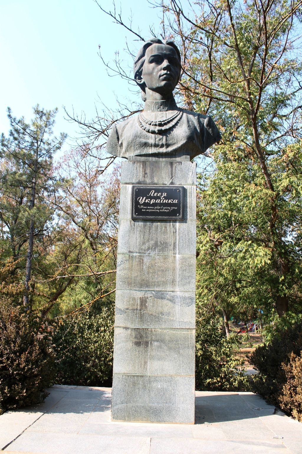 Предмет охраныобъекта культурного наследия регионального значения «Памятник Лесе Украинке», 1987 год, расположенного по адресу: Республика Крым, г. Саки, ул. Курортная, парк санатория «Саки» (№ п/п 281)Нематериальные особенности объекта культурного наследияДатировка: дата создания памятника – 1987 год.Историческая (мемориальная) ценность: памятник посвящён Лесе Украинке (Лариса Петровна Косач-Квитка) – поэтессе и выдающейся деятельнице в культурной и литературной жизни Украины конца XIX – начала XX веков.Историческая функция: мемориальная скульптура.Авторство: автор памятника – советский и украинский скульптор Мовчун Петр Федосеевич, лауреат государственной премии СССР, заслуженный художник УССР.Материальные особенности объекта культурного наследияАрхитектурные и конструктивные характеристикиОбъемно-пространственная композиция: памятник представляет собой бюст Леси Украинки с высоким постаментом, установленный на обвалованном стилобате.Охраняются: местоположение, композиция памятника.Бюст: бюст представляет собой погрудный портрет Леси Украинки без головного убора, в вышиванке, с ожерельем на груди, волосы собраны назад, лицо открытое, взгляд задумчивый, направленный вдаль. Бюст выполнен в технике в технике бронзового литья, покрыт черной патиной. Высота бюста 1,9 м.Охраняются: местоположение, форма, размеры, композиция скульптурного портрета, техника исполнения, материал, цветовое решение.Постамент: постамент призматической формы, габаритные размеры постамента: 0,85 х 0,85 х 2,9(h) м. Выполнен из бетона, поверхность облицована шлифованными плитами из серого гранита.Охраняется: местоположение, конфигурация, размеры, тип материала постамента, тип отделки, цветовое решение.Стилобат: основание памятника бетонное, габаритные размеры 3,2 х 3,2 х 1,1(h) м, обваловано небольшой насыпью. С трех сторон насыпь ограждена бетонной подпорной стенкой, облицованной рваным камнем. Высота стенки и обваловки до 1,0 м. С восточной стороны памятнику ведет одномаршевая прямая лестница шириной 3,2 м. Поверхности основания облицованы плитами из серого шлифованного гранита.Охраняется: – местоположение, конфигурация, габариты, тип материала основания, тип отделки – облицовка гранитом;– местоположение, конфигурация, габариты, тип материала отделки подпорных стен и обваловки;– местоположение, конфигурация, габариты лестницы.Мемориальная доска: на лицевой грани постамента установлена мемориальная доска, из камня габбро (размером 0,4 х 0,6 м). С памятной надписью: «Леся Украiнка «Менi таки добре в цьому сонцi та морському повiтрi!».Охраняется: местоположение, содержание текста, техника исполнения, язык.Благоустройство территории: памятник расположен в парке санатория «Саки», ориентирован на восток, на центральную аллею парка. Основание памятника обваловано небольшой насыпью размерами 18,0 х 7,0 м. С трех сторон насыпь ограждена бетонной подпорной стенкой, облицованной рваным камнем. Высота стенки и обваловки до 1,0 м. С восточной стороны памятнику ведет лестница шириной 3,2 м. Насыпной холм вокруг памятника озеленен декоративным кустарником.Перед памятником благоустроена площадка отдыха прямоугольной формы с цветником и скамейками. Покрытие площадки выполнено из бетонной тротуарной плитки.Охраняется: местоположение, габариты, конфигурация благоустро