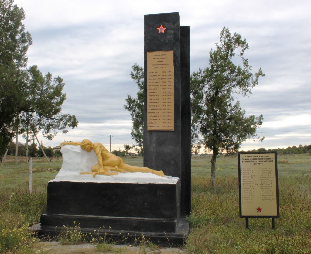 Предмет охраны объекта культурного наследия регионального значения «Памятный знак в честь воинов – односельчан, погибших в годы Великой Отечественной войны», 1941-1945 годы, 1967 год, расположенного по адресу: Республика Крым, Сакский район, сельское поселение Крайненское, с. Крайнее.Историко-художественная ценностьАвторское решение памятника (автор Кривенко И.В.).Мемориальное сооружениеМемориальная композиция, состоящая из скульптуры на постаменте, вертикальной стелы и мемориальных досок.Охраняется: местоположение, композиция памятника.СкульптураСкульптура выполнена из бетона (габаритные размеры 2,5х0,8х0,85(h) м) с изображением раненного бойца с автоматом в руке, полулежащего на каменной глыбе. Поверхность скульптуры окрашена в золотистый цвет. Основание скульптуры и каменная глыба выполнены из бетона (габаритные размеры 2,5х0,8х0,75(h) м), окрашены в белый цвет.Постамент трехступенчатый, выполнен из бетона (габаритные размеры нижней части 3,05х1,55х0,2(h) м, средней – 2,7х1,25х0,2(h) м, верхней 2,7х1,0х0,65(h) м). Поверхность постамента оштукатурена цементно-песчаным раствором и окрашена в черный цвет.Охраняется:- постамент, основание: местоположение, конфигурация, габариты, тип материала; тип отделки, цветовое решение - после проведения комплексных научных исследований; - скульптура: местоположение, конфигурация, форма, размер, тематика (сюжет), тип материала, техника исполнения; цветовое решение - после проведения комплексных научных исследований.СтелаСтела сложной формы в плане выполнена из бетона (габаритные размеры 1,0х0,6х5,0(h) м). Поверхность стелы оштукатурена и окрашена в черный цвет. На лицевой поверхности стелы установлена мемориальная доска из пластика (габаритные размеры 0,6х0,8 м) золотистого цвета, на которой выполнена надпись: «Вечная слава жителям с. Крайнее, павшим в боях с фашизмом 1941-1945 гг.». Ниже указаны фамилии, инициалы, годы жизни (см. Историческую справку и Карточку объекта). В верхней части стелы закреплена пятиконечная звезда из металла, окрашенная в красный цвет.Охраняется:- стела: местоположение, конфигурация, габариты, тип материала; тип отделки, цветовое решение - после проведения комплексных научных исследований; - мемориальная доска – местоположение;- мемориальная надпись – местоположение, содержание (после реставрации): «Вечная слава жителям села Крайнее (Теший), отдавшим жизнь в боях за свободу нашей Родины в годы Великой Отечественной войны! 1941-1945 гг.»- списки погибших воинов-односельчан (с возможностью уточнения по данным архивов).Мемориальная доскаМемориальная доска выполнена из пластика золотистого цвета, вставлена в стальную рамку на металлических стойках. На доске выполнена надпись: «Вечная память жителям с. Крайнее, воевавшим на фронтах Великой Отечественной войны 1941-1945». Дальше указаны фамилии и инициалы (см. Карточку объекта). Ниже изображена пятиконечная красная звезда.Не входит в предмет охраны.БлагоустройствоПамятник расположен на бетонной площадке (габаритные размеры 3,5х28,7 м). Территория памятника (19,0х30,0 м) ограждена стальной решеткой высотой 1,05 м. Вокруг памятника растут кустарники и хвойные деревья.Охраняется:местоположение, конфигурация, композиция благоустроенной территории.Предмет охраны может уточняться после проведения комплексных научных исследований.