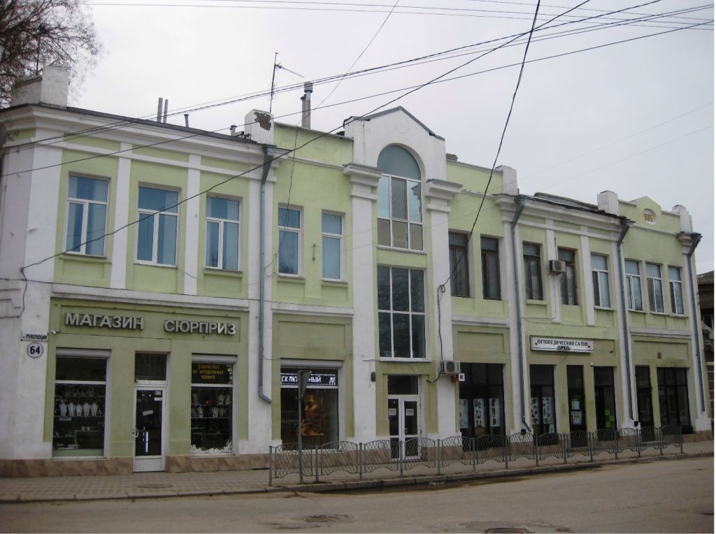 Предмет охраны объекта культурного наследия регионального значения «Доходный дом С.М.Сербинова, начало XX века», расположенного по адресу: Республика Крым, г.Евпатория, ул. Революции, 64/2, литеры «А», «А1».Нематериальные особенности объекта культурного наследияДатировка: начало XX века.Историко-художественная ценность: оформление фасадов, характерное для застройки Евпатории начала ХХ века – в стиле модерн.Историческая функция: доходный дом.Градостроительная ценность: формирует угол застройки ул. Революции и ул. Краевского.Материальные особенности объекта культурного наследияГрадостроительные характеристикиМестоположение: по «красным» линиям застройки ул. Революции и ул. Краевского. Охраняется местоположение.Габариты, силуэт. Охраняются: габариты и силуэт на начало XX века.Архитектурные и конструктивные характеристики.Объемно-пространственная композиция: здание П-образное в плане, двухэтажное с подвалом под частью здания. Охраняется объемно-пространственная композиция: конфигурация в плане, количество этажей, высотные отметки по венчающим карнизам.Крыша: крыша скатная. Охраняются: конфигурация (форма) крыши, высотные отметки по конькам, тип материала кровли (после проведения реставрационных работ и восстановления исторического облика).Композиция и архитектурно-художественное оформление фасадов.Главный (южный) фасад по ул. Революции ассиметричный. Членение фасада по горизонтали выполнено тягой простого профиля, расположенной над цоколем и разорванной на проемах, межэтажной профилированной тягой, разорванным на аттиках профилированным венчающим карнизом и тягой простого профиля, расположенной под ним; членение по вертикали выполнено пилястрами, капители которых переходят в венчающий карниз.Главный вход относительно центра фасада смещен влево. Проем главного входа прямоугольный, обрамлен по бокам нишами в уровне середины и верха двери. Над входом на втором этаже расположено большое прямоугольное окно с профилированным подоконником, над ним – большое арочное окно с профилированным подоконником. Выше – аттик.Помимо главного входа, на фасаде расположены три второстепенных прямоугольных дверных проема. Окна первого этажа прямоугольные, доходящие до цоколя. Над ними – филенки. Окна второго этажа прямоугольные, большинство с профилированными подоконниками. Под ними – филенки.С правой стороны фасада расположен еще один аттик с овальным окном.Левый угол здания, выходящий на пересечение улиц Революции и Краевского скошен, венчается небольшим аттиком.Западный фасад по ул. Краевского симметричный. Ось симметрии замыкается аттиком с овальным окном. Фасад имеет членение, аналогичное с южным фасадом, за исключением тяги простого профиля, расположенной над цоколем. Сам цоколь не выделен. Окна первого этажа с пониженной аркой, обрамлены наличниками и профилированными подоконниками. Окна второго этажа прямоугольные, с профилированными подоконниками.Охраняется композиция и архитектурно-художественное оформление главного (южного) и бокового (западного) фасадов: местоположение, форма, размер и количество оконных и дверных проемов, декоративное обрамление оконных и дверных проемов, декоративное членение плоскости стен, тип материала и рисунок декоративных элементов.Элементы водоотведения.Охраняются (после пр