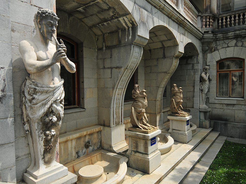 Предмет охраны объекта культурного наследия федерального значения «Комплекс сооружений дворца Александра III, 1880-1902 годы»: «Скульптурная группа на западном фасаде: Три чаши фонтанов», расположенного по адресу: Республика Крым, городской округ Ялта, пгт.Массандра, ул.Симферопольское шоссе, 13.Градостроительные характеристики.Местоположение: объект расположен в северо-восточной части современной территории дворцово-паркового ансамбля в Верхней Массандре, у западного фасада (фактически являясь его элементом) Дворца императора Александра III.Охраняется: - историческое местоположение памятника и его композиционная роль в ансамбле и окружающей ландшафтно-градостроительной ситуации.Секторы и направления видовых раскрытий, визуальные связи памятника.Охраняются: - сохранившиеся исторические видовые/визуальные раскрытия на объект культурного наследия; визуальные связи памятника на начало ХХ века.Архитектурно-композиционные характеристики и элементы.Объемно-пространственная структура; исторические габариты.Объемно-пространственная композиция сооружения на начало XX века: являющаяся неотъемлемым элементом объёмно-пространственной структуры Дворца императора Александра III стоящая на основании, которым служит прямоугольная в плане верхняя площадка примыкающей к западному фасаду дворца лестницы, семичастная скульптурная группа, формируемая двумя скульптурами сатиров (фланкирующие), двумя скульптурами драконов и тремя чашами фонтанов между ними. Охраняется: - историческая конфигурация плана и объёмно композиционное решение, исторические габариты.Композиция и архитектурно-художественное оформление.Композиция и оформление на начало XX века: фонтанные чаши – установленные вплотную к стене три низкие чаши фонтанов, прямоугольные в плане со скругленной передней частью и сглаженным бортиком, с круглыми постаментами для утраченных скульптур в каждой чаше; по две водометные металлические насадки встроены в выступающее пространство стены фасада дворца.Элементы композиции и декора и их характеристики, в том числе: месторасположение и форма фонтанных чаш.Характеристики утраченных элементов композиции на начало ХХ века.Охраняются: - сохранившиеся подлинные элементы/детали композиции; композиционное решение и характер декоративного оформления (в том числе утраченных элементов композиции) на начало XX века.Фактура поверхности: фактура поверхности элементов композиции на начало XX века: гладко обработанный природный и искусственный камень.Охраняется: - характер отделки поверхности сооружения на начало XX века.Колористическое решение: колористическое решение на начало ХХ века (уточняется по результатам реставрационных исследований).Охраняется: - колористическое решение на начало ХХ века.Материаловедческие характеристики.Материал изготовления фонтанных чаш - природный (гаспринский и мраморовидный известняк) камень (уточняется по результатам реставрационных исследований).Материал изготовления насадок для фонтанов – металл.Материаловедческие характеристики утраченных элементов композиции (уточняется по результатам реставрационных исследований).Охраняются: - материаловедческие характеристики начала ХХ века.Предмет охраны может конкретизироваться при изменении степени исследованности памятника.