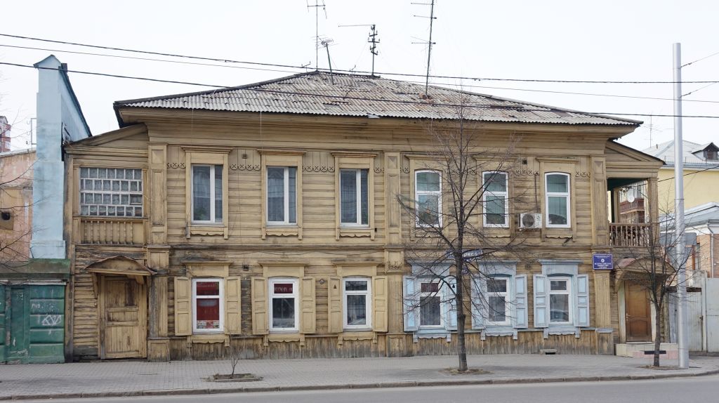 1. Градостроительные характеристики1.1. Местоположение объекта в системе застройкиОбъект расположен вдоль красной линии четной стороны улицы Карла Маркса, главным южным фасадом обращен к улице.1.2. Композиционная значимостьРасположенный в исторической части г. Красноярска, объект участвует в формировании линии застройки северной стороны ул. Карла Маркса.1.3. Габариты и силуэт:почти квадратный, «Т»-образный в плане.1.4. Секторы и направления видовых раскрытий, визуальные связи объектаОбъект раскрывается с участка улицы Карла Маркса, ограниченного улицей Парижской Коммуны и проездом с улицей Карла Маркса до улицы Урицкого.2. Архитектурные и конструктивные характеристики2.1. Объемно-пространственная композицияДвухэтажный объем с прирубами с северного, восточного и западного фасадов. На восточном и западном прирубах на уровне второго этажа расположен балкон.2.2. Конструкция крышиОсновной объем покрыт вальмовой стропильной крышей с многопрофильным большого выноса карнизом. Западный и восточный прирубы перекрыты односкатными крышами. Северный прируб перекрыт двухскатной крышей с выступающим фронтоном. В северной части крыши расположено слуховое окно прямоугольной формы.2.3. Композиция и архитектурно-художественное оформление фасадов2.3.1. Северный фасад2.3.1.1. Композиция северного фасадаФасад образован основным объемом, центральным прирубом, восточным и западным прирубами.Фасад основного объема решен в четыре оси оконных проемов. Окна с лучковым завершением. Прируб выполнен в две оси дверных проемов. Фасады основного объема завершены карнизом с фризом, боковые прирубы завершены треугольными фронтонами, фронтон центрального прируба с треугольным продухом.2.3.1.2. Декор северного фасада:наличники с прямыми профильными сандриками;фартук фигурный со свесами;двухстворчатые филенчатые ставни на первом этаже;наличник второго этажа с резным картушем;профильные фризы и карнизы;филенчатые лопатки.2.3.2. Восточный фасад2.3.2.1. Композиция восточного фасадаФасад образован прирубами с восточной и северной сторон основного объема. Одна ось оконного проема первого этажа восточного прируба.Три оси оконных проемов второго этажа: две оси основного объема и одна ось восточного прируба. Окно первого этажа и окна второго этажа основного объема с лучковым завершением. Окно второго этажа восточного прируба – прямоугольное.Завершает фасад карниз основного объема и карнизы прирубов.2.3.2.2. Декор восточного фасада:наличники с прямыми профильными сандриками;фартук фигурный со свесами;двухстворчатые филенчатые ставни на первом этаже;профильные карнизы;филенчатые лопатки;балкон с резными балясинами;колонны балкона, обшитые филенками.2.3.3. Южный фасад2.3.3.1. Композиция южного фасадаСимметричный фасад образован основным объемом с зашитыми лопатками перерубами с примыкающими по бокам прирубами с балконами. Первый и второй этаж разделяет профилированный пояс.Фасад решен в шесть оконных осей и две дверных оси. Окна с лучковым завершением, двери прямоугольные.Завершает фасад карниз и фриз основного объема и треугольные фронтоны прирубов.2.3.3.2. Декор южного фасада:фриз с крупным подзором;наличники с прямыми профильными сандриками;фартук фигурный со свесами;двухстворчатые филенчатые ставни на первом этаже;профильные пояса и карнизы;филенчатые лоп