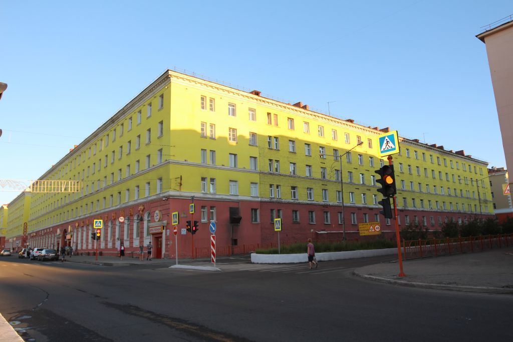 1. Градостроительные характеристики1.1. Местоположение объекта в системе городской застройкиОбъект расположен в центральной части г. Норильска, на южном углу перекрестка Ленинского проспекта и ул. Советская. Объект выходит на Ленинский проспект протяженным северо-восточным фасадом, на ул. Советскую – протяженным северо-западным фасадом.1.2. Композиционная значимостьОбъект является частью архитектурного ансамбля застройки центра города, формирует линию застройки южного угла перекрестка Ленинского проспекта и ул. Советской.1.3. Габариты и силуэтГабариты и высотные отметки здания на дату строительства (1957 г.).1.4. Секторы и направления видовых раскрытий, визуальные связи объектаОбъект преимущественно раскрывается с перекрестка Ленинского проспекта и ул. Советской; с участка ул. Советской, ограниченного ул. Богдана Хмельницкого и ул. Завенягина; с участка Ленинского проспекта, ограниченного ул. Московской и ул. Павлова. 2. Архитектурные и конструктивные характеристики2.1. Объемно-пространственная композиция на дату строительства (1957 г.)Крупное 5-этажное, П-образное в плане, здание, обращенное на юго-запад торцами боковых (северное и южное) крыльев, примыкающих к центральному объему, протяженному вдоль Ленинского проспекта. К торцу южного крыла с севера и юга пристроены два объема. Посередине центрального объема расположен высокий арочный проезд во двор с Ленинского проспекта.Под зданием выполнен технический этаж.Первый этаж здания со стороны Ленинского проспекта двухсветный (соответствует по высоте двум стандартным этажам), остальные 4 надземных этажа (со 2-го по 5-й) одинаковые по высоте. В боковых крыльях распложено по 5 одинаковых этажей.2.2. Конструкция крыши на дату строительства (1957 г.)Крыша вальмовая со слуховыми окнами. Кровля металлическая по деревянным стропилам и обрешетке.2.3. Композиция и архитектурно-художественное оформление фасадов на дату строительства (1957 г.)2.3.1. Фасад 1Композиция фасадаКомпозиция фасада симметричная. Фасад решен в 28 осей проемов. Проем арочного проезда соответствует осям 14, 15 вышерасположенных этажей. Крайним боковым осям и осям, фланкирующим арочный проезд, в уровне первого этажа соответствуют дверные проемы прямоугольной формы, оформленные прямоугольными порталами с прямыми карнизами, над которыми расположены круглые окна-люкарны. Высокие прямоугольные проемы первого этажа имеют арочные (полукруглые) завершения, окна этажей со 2-го по 5-й прямоугольные.Под окнами 2-го и 3-го этажей проходят пояса.Фасад завершен карнизом и фризом.Декоративное оформление фасада:филенки, расположенные во впадинах под окнами первого этажа;профилированные обрамления окон-люкарн;профилировка фриза, венчающего карниза и подоконных поясов;ряд сухариков, проходящий понизу венчающего карниза;профилировка карнизов порталов;ряд сухариков, проходящий под карнизом порталов.рамочный наличник простого профиля, расположенный на плоскости порталов;подоконные полочки;рустовка первого этажа (над арками оконных проемов – веерная, в простенках – горизонтальная).2.3.2. Фасад 2Композиция фасадаФасад решен в 18 осей прямоугольных оконных проемов. Узкие окна, соответствующие осям 13 и 14, 17 и 18, сгруппированы попарно.Под окнами 2-го и 3-го этажей проходят пояса.Фасад завершен карнизом и фризом.Декоративное оформление фасада:про