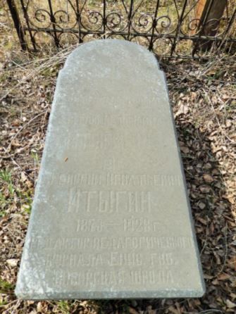 1. Местонахождение объектаОбъект расположен в северо-восточной части сектора № 4 Троицкого кладбища г. Красноярска.2. Захоронение (могила) в полном объеме:захоронение тела (останков) человека.3. Надгробное сооружение3.1. Тип памятникаНадгробная мраморная плита с прямоугольным основанием и округлым завершением, уложенная на кирпичное оштукатуренное основание в форме прямоугольного параллелепипеда.Размеры: высота от поверхности земли 0,40 м, ширина плиты 0,70 м, длина 1,62 м.3.2. Техника и материалы памятника:высекание, резьба по темно-серому мрамору.3.3. Особенности обработки поверхности:шлифовка поверхности плиты.3.4. Надписи с оригинальными названиями композиций и тексты, введенные в состав памятникаНа поверхности плиты высечена надпись: «КАЛЕРiЯ СЕМЕНОВНА И ЕВГЕНiЯ ГЕОРГiЕВНА ИТЫГИНЫ 1913. ГЕОРГИЙ ИГНАТЬЕВИЧ ИТЫГИН 1873 – 1928 г. РЕДАКТОР ПЕДАГОГИЧЕСКОГО ЖУРНАЛА ЕНИС. ГУБ. СИБИРСКАЯ ШКОЛА».В верхней части плиты высечен крест.4. Историческое (мемориальное) значение:памятник истории, связанный с именем Георгия Игнатьевича Итыгина, просветителя, внесшего значительный вклад в развитие Хакасской национальной школы и образования в Сибири.