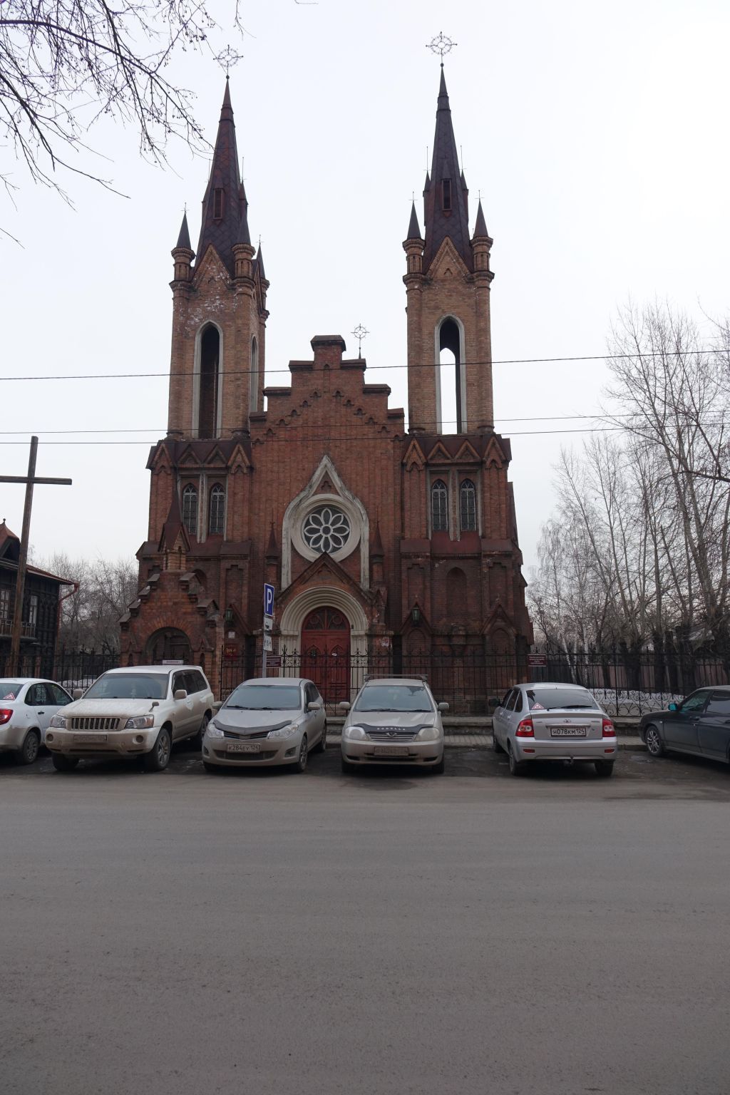 1. Местоположение, роль и градостроительные характеристики зданияЗдание костёла в комплексе с домом ксендза расположено в историческом центре города и служит ядром небольшой архитектурно-исторической застройки рубежа XIX–XX веков в квартале между улицами Горького, Декабристов, Карла Маркса и Бограда; западным фасадом выходит на ул. Декабристов, отступая от линии её застройки.2. Объёмно-пространственная композиция зданияКирпичное одноэтажное с поздним подвалом здание в формах неоготики. В плане представляет собой латинский крест с небольшими выступами трансепта и гранёной апсидой. На западном фасаде симметричные крупномасштабные высокие башни-колокольни, фланкирующие ступенчатый высокий фронтон-щипец, под которым размещён портал главного входа. Над средокрестием небольшая башенка со шпилем. В простенках щипцов северного и южного фасадов устроены контрфорсы, оканчивающиеся башенками. Кровля выполнена сочленением протяжённой двухскатной кровли среднего нефа с поперечными двухскатными кровлями над щипцами. Фасады выполнены лицевой кирпичной кладкой, цокольная часть из гранитных плит, наличники окон оштукатурены.3. Южный фасад3.1. Композиция южного фасада на нач. ХХ в.Фасад решён в 4 оконных оси бокового нефа, одна из которых (соответствует трансепту) выделена на фасаде ризалитом.Окна стрельчатой формы. Окно ризалита крупнее.Участки стен между контрфорсами, фланкирующими оконные оси и ризалит, завешены треугольными щипцами.С западной стороны фасад фланкирует трёхъярусная 4-гранная с проёмами звона башня-колокольня, завершающаяся узкими шатрами со срезанными углами.С восточной стороны фасад продолжает гранёная апсида.3.2. Декор южного фасада на нач. ХХ в.Окна обрамлены профилированными штукатурными наличниками.Массивные контрфорсы с четырёхгранными фиалами прорезаны нишами стрельчатого и ступенчатого завершения.В нижнем ярусе колокольни – ниши стрельчатого завершения с небольшими многогранными пьедесталами на конусовидном кронштейне.Вертикальные борозды в полкирпича шириной прорезают всю поверхность стен фасада между контрфорсами и завершаются в верхней части маленькими арочками.4. Западный фасад4.1. Композиция западного фасада на нач. ХХ в.Фасад трёхчастный, симметричный.Башни-колокольни фланкируют ступенчатый высокий фронтон-щипец.Симметричные крупномасштабные высокие трёхъярусные 4-гранные с проёмами звона башни-колокольни, завершаются узкими шатрами со срезанными углами. Перспективный портал входа по центральной оси здания.Окно-«роза» над входом.Форма, местоположение и размер оконных проёмов.4.2. Декор западного фасада на нач. ХХ в.В первом ярусе башен-колоколен двухъярусные контрфорсы фланкируют высокую нишу, во втором – два окна стрельчатого завершения.Башни-колокольни отмечены на углах узкими многогранными колонками, завершёнными в уровне щипцов кровли многогранными высокими башенками-фиалами.Колокольни завершаются узкими шатрами со срезанными углами и четырьмя вытянутыми слухами под двускатными кровельками, ориентированными по сторонам света.Перспективный портал входа оштукатурен, завершён треугольным фронтоном, который фланкируют фиалы.Вертикальные борозды в полкирпича шириной прорезают всю поверхность западного фасада между колокольнями и завершаются в верхней части маленьки