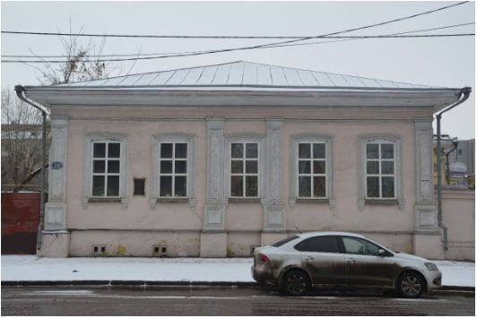 I. Местоположение, роль и градостроительные характеристики усадьбыУсадьба находится в историческом центре, в ряду застройки улицы Карла Маркса, в квартале, ограниченном ул. 9 Января, пр. Мира, ул. Парижской Коммуны и ул. Карла Маркса. Ворота примыкают к юго-восточному углу флигеля.Условия зрительного восприятияВоспринимается с южной стороны ул. Карла Маркса с середины участка, ограниченного ул. Парижской Коммуны и ул. 9 Января.II. Флигель1. Объемно-пространственная композиция здания в целомВысокий одноэтажный деревянный на кирпичном цоколе флигель под вальмовой крышей, оштукатуренный и оформленный под каменный дом. Флигель прямоугольный в плане, вытянут вглубь участка и имеет с востока выступающий тамбур главного входа с лучковым фронтоном. В тамбур ведет крыльцо, над которым расположен опирающийся на криволинейные кронштейны козырек с лучковым фронтоном, подобным фронтону тамбура. Второй вход расположен со стороны двора (с севера), на месте утраченной пристройки, вход в подвал осуществляется через приямок, расположенный на дворовой половине флигеля (с востока). 2.Внутренняя планировкаУгловой трехоконный зал на юго-востоке и двухоконный зал на юго-западе связаны между собой анфиладно, остальное пространство здания имеет Г-образную коридорную планировку.3. Колористическое решениеСтены окрашены в желтый цвет, наличники, карниз, подкарнизная тяга и лопатки – в белый. 4. Южный фасад4.1. Композиция фасадаФасад симметричный, решен в пять осей оконных проемов с лучковым завершением. Композиционно фасад разбит широкими филенчатыми лопатками на три прясла. В центральном прясле одна оконная ось, в боковых пряслах – по две оси. Подшивной профилированный карниз большого выноса имеет подкарнизную профилированную тягу. Под карнизом проходит узкий плоский фриз, отделенный от поля стены тягой, раскрепованной по лопаткам. Высокий цоколь выделен уступом и раскрепован по лопаткам, имеет прямоугольные сдвоенные продухи на второй и пятой осях. С востока фасад удлинен пристройкой тамбура в одну оконную ось с лучковым завершением (пристройка ниже основного объема).4.2. Декоративное оформление фасадаФиленчатые лопатки обрамлены профилированными тягами, внутри филенки оштукатурены «под шубу». Пьедесталы лопаток декорированы квадрами, обведенными профилированной тягой. Окна обведены профилированной тягой, опирающейся в уровне подоконников на декоративные кронштейны, украшенные орнаментом растительного характера.5. Западный фасад5.1. Композиция фасада Фасад асимметричный, решен в пять осей оконных проемов с прямым завершением. Композиционно фасад разбит широкими филенчатыми лопатками на четыре прясла. Окна подвала меньше по высоте, чем окна первого этажа, расположены на первой, второй и третьей осях, имеют лучковое завершение. В центральных пряслах – по две оконные оси, в боковом (северном) прясле – одна. Подшивной профилированный карниз большого выноса имеет подкарнизную профилированную тягу. Под карнизом проходит узкий плоский фриз, отделенный от поля стены тягой, раскрепованной по лопаткам. Высокий цоколь выделен уступом.5.2. Декоративное оформление фасада Филенчатые лопатки обрамлены профилированными тягами, внутри филенки оштукатурены «под шубу». Окна обведены профилированной тягой.6. Северный фасад6.1. Композиция фасада Углы 