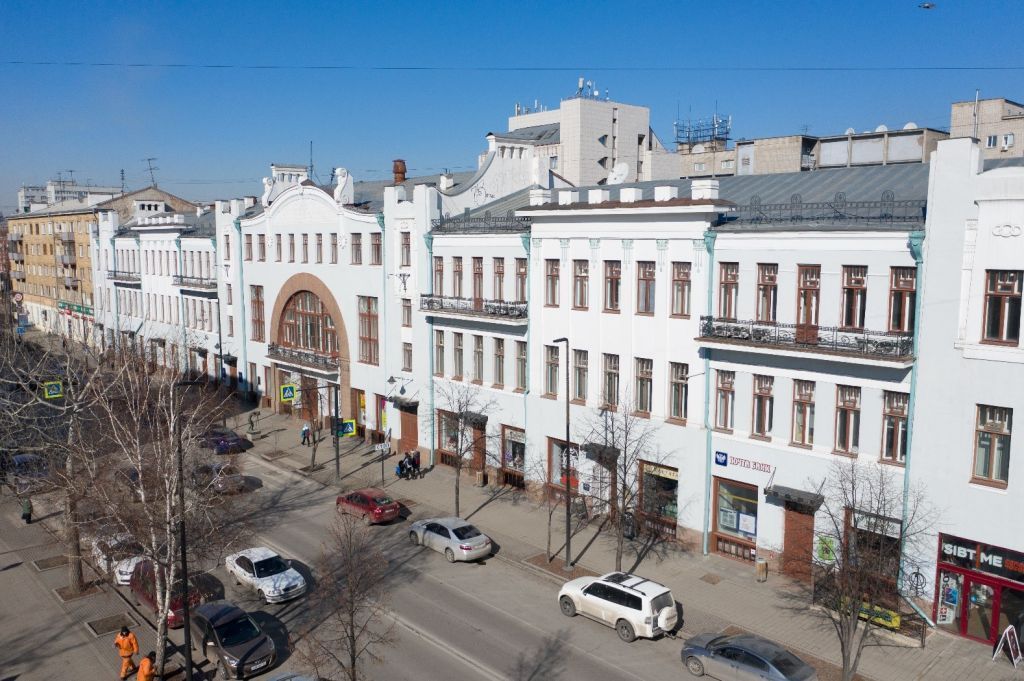 1. Местоположение, роль и градостроительные характеристики здания:Здание расположено в историческом центре города, на пр. Мира, в границах квартала, образованного пересечением пр. Мира, ул. Диктатуры Пролетариата, ул. Ленина и ул. Кирова; формирует значительный участок северной стороны пр. Мира и значительную часть квартала. Протяжённым южным фасадом с шестью слегка выступающими ризалитами здание выходит на линию застройки пр. Мира, к его глухим торцам примыкают соседние здания.2. Объёмно-пространственная композиция здания в целом:Трёхэтажное, вытянутое с востока на запад кирпичное здание наглубоком подвале, под двухскатной крышей с металлической кровлей, уложенной по деревянным стропилам и обрешётке. Во двор ведёт проездная арка. Внутренняя несущая продольная стена смещена к северу. Из семи лестниц одна размещена в центральной части передней половины дома и ведёт только до второго этажа средней части дома с большим высоким залом, освещённым арочными окнами с обоих фасадов. По сторонам зала встроены антресольные помещения между вторым и третьим этажами. В повышенную среднюю часть третьего этажа ведут из коридоров-крыльев внутренние лестницы в 10ступеней.3. Северный фасад:3.1. Композиция северного фасада на нач. XX в.Симметричен, разделён шестью одноосными выступами лестничных клеток, которые делят фасад на 5 западающих частей. Крайние западающие участки решены в 4 оси первого этажа, включая арки проездов, верхние этажи решены в 8 осей. Средняя западающая часть фасада решена в 7 осей первого этажа, 3 оси второго этажа и 9 осей третьего этажа. Участки стен, фланкирующие центральную часть, решены в 3 оси первою этажа и в 6 осей второго и третьего этажей.Форма, местоположение и размер оконных проёмов.3.2. Декор северного Фасала на нач. XX в.Фасад гладко оштукатурен. Венчающий карниз оформлен простым профилем. Центральное арочное окно обрамлено наличником простого профиля.4. Южный фасад:4.1. Композиция южною фасада на нач. XX в.Композиция фасада трёхчастная. Средний блок выше боковых и завершён волнообразным подъёмом карниза. Все три блока фасада фланкированы одноосными ризалитами-пилонами. Крайние пилоны, за которыми следуют одноосные заглублённые части фасада, прорезаны арочными проездами (восточный заложен), в средних - парадные входы. Средняя часть фасада симметрична, решена в 7 осей витрин первого этажа, 3 оси второго этажа и 9 осей третьего этажа. Боковые крылья симметричны, решены в 15 осей со слегка выступающими ризалитами в центре.Форма, местоположение и размероконных проёмов.4.2. Декор южного фасада на нач. XX в.Средний блок завершён волнообразным подъёмом карниза, фланкированным полуфигурами сфинксов. Под полуфигурами сфинксов опускаются плоские фигурные кронштейны, вычленяющие поле тимпана, заполненное ковром из цветов лотоса. Полуциркульный проём второго этажа фланкирован крупными прямоугольными окнами и обрамлён рустованным наличником. Переплёты трёх проёмов оформлены витыми полуколонками. Одноосные ризалиты-пилоны сужаются кверху и переходят в высокие тумбы завершения. Верхние окна ризалитов включены в крупные накладки - «порталы». Середину боковых крыльев фасада занимают слегка выступающие ризалиты, оформленные шестипилястровыми портиками, объединяющими второй и третий этажи. Ризалиты завершены антаблементами с 