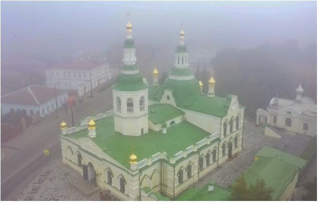 I. Местоположение и градостроительные характеристики «Спасской церкви», «Ансамбля: сторожка, ворота» (далее – ансамбль)Ансамбль расположен в историческом центре города Минусинска, близ протоки реки Енисей, в границах квартала, образованного пересечением улиц Комсомольская, Красных Партизан, Мартьянова, Ленина, в западном углу бывшей Соборной (Гостинодворской) площади. Здание Спасской церкви занимает северо-западную часть участка, около половины всей площади (совместно с прилегающей территорией), здание сторожки расположено в юго-западной части, справа от юго-западного угла церкви – сохранившееся звено ограды и ворота, примыкающие к северному фасаду сторожки (богадельни).Главным элементом по размеру и планировочному решению является Спасская церковь, прочие элементы занимают второстепенное положение.Дорожки устроены по периметру ансамбля, а также между объектами ансамбля. Видовые раскрытия со стороны улиц Комсомольская, Ленина, Красных Партизан, а также перекрёстков этих улиц.II. Спасская церковь1. Градостроительные характеристики1.1. Местоположение Здание расположено в северо-западном углу участка ансамбля. Находится в единой объёмно-пространственной композиции с другими элементами ансамбля.1.2. Композиционная значимость Композиционное ядро и высотная доминанта ансамбля. 1.3. Габариты и силуэт на дату постройки (нач. ХIХ в.):Габариты и высотные отметки здания.1.4. Секторы и направления видовых раскрытий, визуальные связиРаскрывается с участка ул. Комсомольская, ограниченного ул. Ленина и ул. Красных Партизан, а также с участка ул. Красных Партизан, ограниченного ул. Мартьянова и ул. Комсомольская. 2. Архитектурные и конструктивные характеристики2.1. Объёмно-пространственная композиция нач. ХIХ в.Одноэтажная церковь продольно-осевой композиции сооружена в традициях монументальной архитектуры Сибири XVIII века. Основной объём здания – квадратный в основании четверик с гранёным выступом алтаря перекрыт восьмигранным сомкнутым сводом.Западная и восточная стены храма завершены лекально изогнутыми подвышениями с овальными люнетами. С севера и юга к храму примыкают двухсветные повышенные объёмы приделов с полукруглыми апсидами. Фасады приделов завершены щипцами, повторяющими форму храмовых подвышений. С запада, охватывая с трёх сторон колокольню, к объёму здания примыкает одноэтажная пристройка с центральным входом, оформленным портиком из четырёх спаренных полуколонн тосканского ордера. Высокая трёхъярусная колокольня представляет собой традиционный восьмерик на четверике с венчанием, аналогичным храмовому.Храм увенчан маленькой главкой на фигурном световом барабане, не имеющем в настоящее время выхода внутрь здания. Барабан приподнят на широкой небольшого подъёма трибуне. Над алтарями и объёмами приделов, аттиком западной пристройки расположены главки на одноярусных глухих барабанчиках, рёбра которых обработаны волютами. 2.2. Композиция и архитектурно-художественное оформление фасадов нач. ХIХ в.2.2.1. Западный фасад2.2.1.1. Композиция западного фасадаВ уровне первого этажа решён в пять осей, центральной из которых соответствует главный вход.Северная ось фасада заложена.Центральной оси соответствует трёхъярусная колокольня с открытым ярусом звона.По западной стене углы и центральная ось фасада (на фронтоне) 