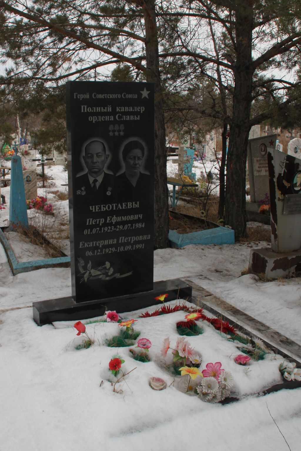 1. Местонахождение памятникаСектор № 57 кладбища «Северное-2» города Минусинска, на расстоянии около 80 метров от главного входа на кладбище.2. Захоронение (могила) в полном объеме Захоронение тела (останков) человека.3. Надписи с оригинальными названиями композиций и тексты, введенные в состав памятникаМемориальная надпись: «Чеботаев Петр Ефимович, 01.08.1923 – 29.07.1984, полный кавалер ордена Славы».4. Историческое (мемориальное) значениеПамятник, связанный с именем Петра Ефимовича Чеботаева, участника Великой Отечественной войны, полного кавалера ордена Славы, сержанта, командира орудия 282-го истребительного противотанкового полка третьей гвардейской дивизии, воевавшего на Ленинградском, Донском и первом Белорусском фронтах, на Курской дуге, принимавшего участие в форсировании Днепра, Вислы, Одера, прошедшего боевой путь от Ленинграда до Берлина.