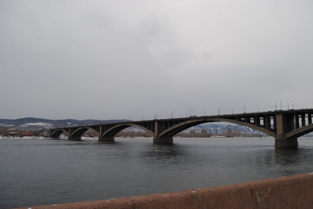 1. Местоположение Выходит с левого берега р. Енисей с ул. Вейнбаума (р-н Театральной площади) на правый берег р. Енисей в районе Предмостной площади через кольцевую транспортную развязку, соединяющую ул. Матросова и пр. им. газеты «Красноярский рабочий».2. Условия зрительного восприятияРаскрытие памятника и восприятие с русла р. Енисей и Абаканской протоки, с левобережной и правобережной набережных. 3. Габариты, техника и основной строительный материал сооружения Общая длина всего мостового перехода – около 2,5 км. Ширина моста между перилами (ограждениями) – 24,1 м. Высота проезжей части над уровнем р. Енисей – 27 м. Основной строительный материал – железобетон и гранит.4. Конструктивные особенности Состоит из правобережного и левобережного подходов, земляной дамбы на острове Отдыха, с арочным путепроводом – пролётом 24 м и двумя съездами для автотранспорта на остров. Река Енисей перекрыта пятью железобетонными арочными пролётами по 150 м каждый, а Абаканская протока – шестью такими же пролётами по 51 м. Пролёты установлены на массивных конусообразных железобетонных опорах, облицованных гранитными блоками. 5. Ограждения пролётовОграждения моста над пролётами составлены из металлических богато украшенных сквозных секций: симметрично относительно осей столбов освещения расположены квадратные металлические вставки цельнолитого сквозного декора с изображением снопа колосьев пшеницы и серпов в круглых рамках (углы квадратных вставок за круглыми рамками оформлены декором растительных форм). Средние части секций металлических ограждений оформлены накладным декором в виде гирлянд с кистями и расположенными над ними круглыми венками.Ограждения на беспролётных участках моста выполнены из глухих гранитных блоков.В уровне пешеходных тротуаров части моста, перекрывающего р. Енисей, по осям опор расположены смотровые площадки в виде балконов на четырёх фигурных кронштейнах, балконы – с глухим ограждением из гранитных блоков. По сторонам въездных частей моста расположены крупные декоративные литые волюты на гранитных блоках.7. Элементы освещения Вдоль пешеходных тротуаров установлены опоры столбов освещения – литые металлические опоры, имеющие пирамидальную форму и украшенные элементами декора по граням, обращённым к пешеходным тротуарам. Грани опор обрамлены рамками. В нижней части опоры каждого столба – декорированная дверка, над которой находится круглая розетка-цветок. Нижняя часть каждого столба освещения оформлена широким профилированным поясом. Столбы освещения, установленные над пролётами моста, вмонтированы в металлические ограждения (между секциями). 6. Четыре лестницы, расположенные возле арочного проезда под мостом на острове ОтдыхаЛестницы трёхмаршевые, ступени выполнены из гранита. Ограждения лестниц выполнены из железобетонных (облицованных гранитом) и цельногранитных блоков. Торцы блоков ступенчатой части ограждений средних площадок лестниц имеют волнообразную форму. На нижней отметке лестниц, по сторонам входов, установлены конусообразные восьмигранные гранитные тумбы на небольших пьедесталах. 6. Историческое (мемориальное) значениеПамятник, связанный с трудовой деятельностью сибиряков-красноярцев. В создании моста принимали участие строители со всего СССР. Группе строителей коммунального 