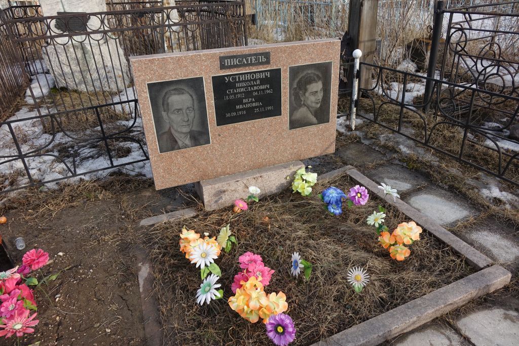 1. Местонахождение памятника:Троицкое кладбище г. Красноярска, западная часть сектора № 6.2. Захоронение (могила) в полном объёме:захоронение тела (останков) человека.3. Надгробное сооружение3.1. Тип памятника: Надмогильное сооружение в форме прямоугольного параллелепипеда на постаменте в форме прямоугольного параллелепипеда. Размеры: надмогильное сооружение 1,25 х 0,75 х 0,11 м, постамент 0,70 х 0,30 х 0,23 м. 3.2. Техника и материалы памятника:высекание по розовому мрамору.3.3. Особенности обработки поверхности памятника: поверхность ошлифована.3.4. Надписи с оригинальными названиями композиций и тексты, введённые в состав памятника:с лицевой (западной) стороны в центральной части надмогильного сооружения две мемориальные доски, размещены одна над другой, с надписями: «Писатель», «Устинович Николай Станиславович 18.05.1912 04.11.1962 Вера Ивановна 30.09.1916 25.11.1991». 3.5. Дополнительные элементы оформления и малые архитектурные формы памятника:с лицевой (западной) стороны по обеим сторонам от мемориальных досок расположены фотографии (гравировка по черному мрамору): слева Н.С. Устиновича, справа В.И. Устинович.3.6. Элементы благоустройства памятника:общий могильный холм обнесён поребриком из розового мрамора.4. Историческое (мемориальное) значение:Памятник, связанный с развитием литературы в Красноярском крае, жизнью и деятельностью писателя Н.С. Устиновича. Николай Станиславович Устинович (18.05.1912 – 04.11.1962) родился в крестьянской семье в д. Горелый Борок Нижнеингашского района Красноярского края. Будучи еще школьником, он начал писать небольшие охотничьи рассказы, публиковавшиеся в журналах и газетах.С 1933 г. начал журналистскую деятельность. Печатался в сибирских газетах и журналах.В 1944 г. на первом туре конкурса Детгиза на лучшую книгу для детей сборники рассказов Устиновича «Лесная жизнь» и «Аромат земли», изданные в Красноярске, были отмечены поощрительными премиями.В 1946 г. Н.С. Устинович, работавший журналистом, в числе первых красноярцев был принят в ряды Союза писателей СССР. Он был одним из тех, кто положил начало Красноярской писательской организации. Здесь он работал вместе с такими писателями, как С. Сартаков, И. Сибирцев, А. Черкасов, поэтами К. Лисовским, И. Рождественским.В конце 1957 г. Н.С. Устинович возглавил Красноярское отделение Союза писателей СССР. Был избран в первый состав правления Союза писателей РСФСР. Он сыграл большую роль в укреплении и росте местной писательской организации. С конца 1961 г. Н.С. Устинович стал редактором альманаха «Енисей». Он был талантливым и самобытным писателем. Им было написано много произведений о природе, родном крае. Среди них такие произведения, как «Золотая падь» (1945), «В краю далёком», «Тихая заводь», «Таёжные встречи» (1953), «Охотничьи рассказы», «След человека» (1961). Целый ряд произведений Устиновича был посвящён новостройкам, целинникам (сборник рассказов «Костёр в степи», 1955 г.). Помимо этого он написал историко-приключенческую повесть по материалам гражданской войны «Саня Лосев», повесть «Замурованный подвал» и другие. В общей сложности в различных издательствах с 1943 по 1962 г. вышло 45 книг писателя. Лучшие произведения Н.С. Устиновича изданы в 1962 году в Красноярске в двухтомнике «Избранное». Многие произведения писателя переводились на иностранные языки.Именем писателя названа улица в городе Красноярск