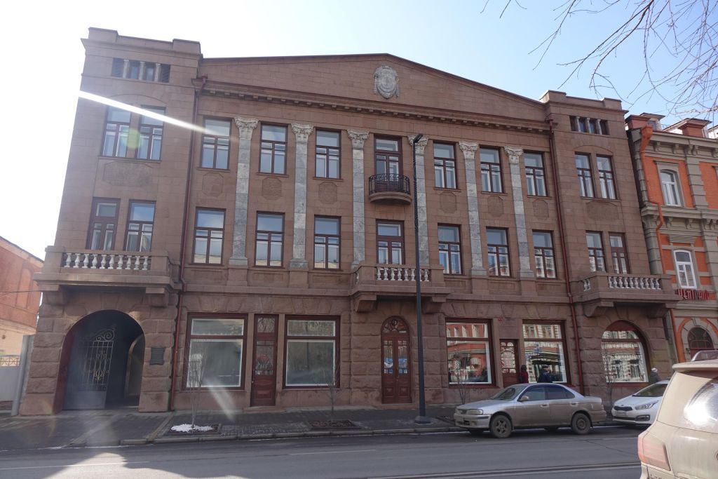1.Местоположение, роль и градостроительные характеристики здания Объект расположен в центральной части города Красноярска. Участвует в формировании историко-архитектурной среды главной улицы (пр. Мира).2.Объёмно-пространственная композиция здания на 1914-1915 гг. Трёхэтажное, Т-обратное в плане кирпичное здание с подвалом.Главный вход в здание находится на центральной оси северного фасада.3. Колористическое решениеЕстественный цвет гранитной облицовки стен и мраморных декоративных деталей. Цвет кровли –красно-коричневый.4.Южный фасад4.1.Композиция южного фасада на 1914–1915 гг.Южный фасад на первом этаже решён в четыре оси оконных проёмов и два дверных проёма. Второй этаж решён в восемь осей оконных проёмов. Третий этаж решён в девять осей оконных проёмов.В восточной части фасада на первом этаже расположен арочный проезд. Наружные стены из кирпича с горизонтальными кирпичными перемычками.5.Западный фасад5.1.Композиция западного фасада 1914–1915 гг.Вплотную к фасаду примыкает здание, расположенное по адресу: Красноярск. Правая часть фасада решена в девять оконных осей. Наружные стены из кирпича с горизонтальными кирпичными перемычками.Западный фасад на первом этаже решён в десять осей оконных проёмов, на втором этаже в девять осей оконных проёмов, на третьем этаже в девять осей оконных проёмов.6.Северный фасад6.1.Композиция северного фасада на 1914–1915 гг. Первый этаж решён в пять осей оконных проёмов (витрин) с тремя дверными проёмами. Второй этаж решён в одиннадцать осей, из них две крайние и центральная ось являются дверными проёмами (балконами), остальные – оконные. На третьем этаже десять осей оконных проёмов и один дверной проём по центральной оси.Симметричная трёхчастная композиция фасада с повышенными боковыми ризалитами. Центральная часть фасада завершена треугольным фронтоном, ризалиты – прямоугольными аттиками.На центральной оси фасада (над входом) и в боковых ризалитах расположены балконы.На третьем этаже на центральной оси фасада находится балкон.Прямоугольные окна второго и третьего этажей (в центральном прясле фасада) равномерно распределены по плоскости фасада.Прямоугольные окна на втором и третьем этажах в ризалитах сгруппированы попарно.На первом этаже крупные витринные окна чередуются с узкими дверными проёмами.Крайнюю к востоку ось на первом этаже занимает арочный проезд во двор.Крайнюю к западу ось на первом этаже занимает крупный арочный оконный проём.Стеновая поверхность центрального прясла на высоту второго и третьего этажей расчленена метрическим рядом пилястр.6.2. Декор северного фасада на 1914–1915 гг. Облицовка гранитными плитами стен второго и третьего этажей, аттиков ризалитов и треугольного фронтона.Крупномасштабная гранитная рустовка стен первого этажа. Ограждения с балясинами балконов второго этажа.Фигурные кронштейны балконов второго этажа. Металлическое ограждение балкона третьего этажа.Плоские пилястры с композитными капителями в центральном прясле.Восьмигранные неглубокие офактуренные филёнки под окнами третьего этажа.Балясины в нишах аттиков ризалитов.Карниз с зубцовым поясом над центральным пряслом.Металлические ролл-ставни на окнах и дверях главного фасада на первом этаже.7.Восточный фacaд7.1.Композиция восточного фасада на 1914-1915 гг.Первый этаж восточного фасада имеет девять 