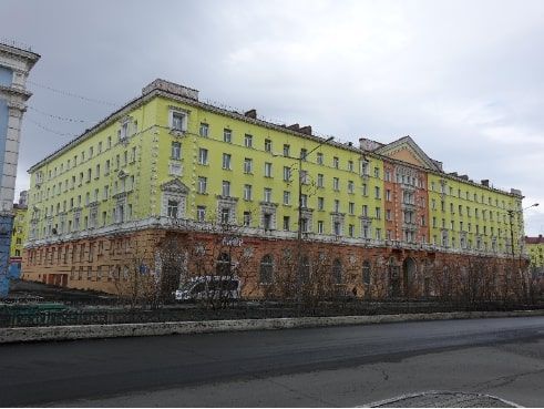 1. Градостроительные характеристики1.1. Местоположение объекта в системе городской застройкиОбъект расположен в историческом центре г. Норильска, на участке, ограниченном Комсомольской и Гвардейской площадями, выходит северо-восточным фасадом на Ленинский проспект. 1.2. Композиционная значимостьОбъект участвует в формировании линии застройки западной стороны Ленинского проспекта. 1.3. Секторы и направления видовых раскрытий, визуальные связи памятникаОбъект раскрывается с участка Ленинского проспекта, ограниченного ул. Павлова и Гвардейской площадью, с Гвардейской площади.2. Архитектурные и конструктивные характеристики2.1. Объемно-пространственная композиция на дату строительства Шестиэтажное, П-образное в плане, здание. К наиболее протяженному центральному (северо-восточному) объему с юго-запада примыкают объемы южного и северного крыльев. Центральный объем по центральной оси прорезан проездной аркой высотой в два этажа. 2.2. Конструкция крыши на дату строительстваКрыша вальмовая, со слуховыми окнами и выпусками каналов инженерных сетей. Кровля металлическая по деревянным конструкциям.2.3. Композиция и архитектурно-художественное оформление фасадов на дату строительства2.3.1. Северо-восточный фасад2.3.1.1. Композиция и декоративное оформление северо-восточного фасада центрального объемаКомпозиция фасада симметричная. В уровне первого и 2-го этажей фасад решен в 14 осей проемов (7-й, 8-й и 14-й осям соответствуют дверные проемы; первой и 14-й осям соответствуют дверные проемы с расположенными над ними небольшими круглыми окнами; остальным осям соответствуют окна двухсветного пространства больших помещений); в уровне 3-го этажа фасад решен в 28 осей проемов (осям 13, 16 и 28 соответствуют проемы балконов, остальным осям – оконные проемы); в уровне 4-го этажа фасад решен в 26 осей оконных проемов; в уровне 5-го этажа фасад решен в 28 осей оконных проемов, в уровне 6-го этажа – в 30 осей оконных проемов. Оконные проемы, соответствующие 3-й, 5-й, 7-й, 9-й, 11-й, 14-й, 15-й, 18-й, 20-й, 22-й, 24-й и 26-й осям в уровне 3-го этажа оформлены имитированными балконами. Ограждения имитированных балконов сквозные, в виде балюстрады с тумбами по бокам, оформленными квадратными ширинками с барельефными накладками растительной формы. Осям 13, 16 с 3-го по 5-й этажи и осям 13, 18 6-го этажа соответствуют вертикальные впадины. Боковые одноосные части фасада с 3-го по 6-й этажи выделены ризалитами. Боковые ризалиты и средняя выступающая часть фасада, расположенная между впадинами в уровне с 3-го по 5-й этажи, оформлены по углам рустом «диаманти».Над 2-м этажом по всему фасаду (включая балконы и имитированные балконы) проходит межэтажный пояс, подчеркнутый широкой профилированной тягой и завершенный узкой профилированной тягой, проходящей под окнами 3-го этажа. Под окнами 6-го этажа по всему фасаду (включая балконы и имитированные балконы) проходит узкая профилированная тяга.Завершение фасада включает в себя: профилированный карниз с рядом модульонов понизу; «оборванные» глухие парапеты по ширине ризалитов над крайними осями; треугольный фронтон по центру фасада, по бокам которого выступают прямоугольные участки высокого глухого парапета. Фронтон имеет широкое профилированное обрамление с профилированными карнизом, украшенным рядом модульонов понизу, и фризовой частью, украшенной