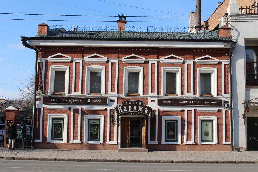 1. Градостроительные характеристики1.1. Местоположение объекта в системе городской застройкиЗдание расположено в историческом центре города по линии застройки пр. Мира в границах квартала, образованного пересечением пр. Мира, ул. Сурикова, ул. Ленина, ул. Вейнбаума. Южным фасадом выходит на красную линию застройки пр. Мира.1.2. Секторы и направления видовых раскрытий, визуальные связи памятникаОбъект раскрывается с южной стороны пр. Мира от перекрестка с ул. Вейнбаума до перекрестка с ул. Сурикова.2. Архитектурные и конструктивные характеристики2.1. Объемно-пространственная композиция на дату строительства (1883 г.)Прямоугольный в плане, двухэтажный дом. Под частью здания выполнен подвал. Главный (южный) фасад симметричный, в уровне обоих этажей решен в 5 осей проемов, в уровне второго этажа представленных оконными проемами лучковой формы. В уровне первого этажа центральная ось представлена дверным проемом центрального входа, прочие оси – оконными проемами лучковой формы. Восточной наружной стеной вплотную примыкает к соседнему зданию – объекту культурного наследия «Дом Токарева с гостиницей «Грандотель», 1915 г.2.2. Композиция и архитектурно-художественное оформление фасадов2.2.1. Южный фасадКомпозиция фасадаСимметричная композиция фасада в 5 осей проемов. Углы обработаны плоскими двухъярусными филенчатыми лопатками, такими же лопатками декорированы межоконные простенки фасада. В уровне первого этажа, на центральной оси, устроен проем главного входа с двустворчатым заполнением.Междуэтажное членение выполнено двумя профилированными штукатурными тягами по низу и верху оконных проемов.Фасад завершен профилированным карнизом небольшого выноса.Цоколь выделен уступом.Декоративное оформление фасадаФриз выделен узкой профилированной тягой, раскрепованной по лопаткам.Подоконная тяга окон второго этажа раскрепована по лопаткам.Проемы обведены плоскими тягами. Над окнами второго этажа расположены треугольные профилированные сандрики.Над окнами первого этажа расположены прямые профилированные сандрики.2.2.2. Западный фасадКомпозиция фасадаАсимметричная композиция фасада в 7 осей проемов. На первой оси первого этажа расположен дверной проем.Северный угол обработан плоской двухъярусной лопаткой, южный угол на первом этаже обработан филенчатой лопаткой.Междуэтажное членение выполнено профилированным подоконным поясом.Фасад завершен профилированным карнизом небольшого выноса.Цоколь выделен уступом.Декоративное оформление фасадаФриз выделен уступом.Подоконная тяга окон второго этажа раскрепована по лопаткам.Проемы обведены плоскими тягами. Под окнами второго этажа устроены «лежачие» филенки.2.3. Колористическое решение на дату строительстваЕстественный цвет красного полнотелого кирпича, детали выделены белым цветом, зеленый цвет крыши.2.4. Проемы: форма, местоположение, размеры оконных проемов в наружных стенах;форма, местоположение, размеры дверных проемов в наружных и внутренних стенах.2.5. Пространственно-планировочная структура интерьеровВ передней (южной) части здания капитальной внутренней поперечной стеной выделен большой торговый зал, дворовая половина дома разделена продольной капитальной стеной и ненесущими перегородками на несколько помещений. Планировка анфиладного типа.2.6. Конструктивные элеме