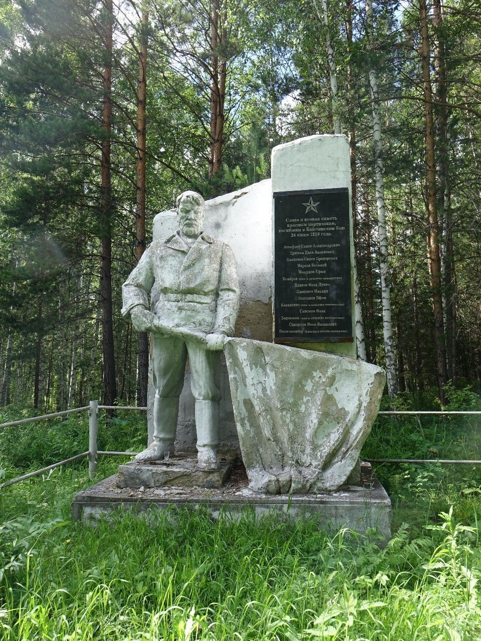1. Местонахождение памятникаОбъект находится в 1,5 км на северо-запад от бывшей деревни Кайтым.2. Захоронение (могила) в полном объемеЗахоронение тел (останков) людей.3. Надмогильное сооружение3.1. Тип памятникаНадмогильное сооружение представляет собой художественную композицию в виде скульптуры партизана, склонившего голову в скорби о погибших, держащего в руках вниз наклоненное знамя, и кирпичной оштукатуренной стелы Г-образной формы в сечении, со скошенной верхней гранью. В основании всей композиции – постамент в форме прямоугольного параллелепипеда. В основании скульптуры – постамент в форме, близкой к прямоугольному параллелепипеду.Высота скульптуры 2,50 м, высота постамента скульптуры 0,15 м, размер основания постамента скульптуры 0,80 х 0,85 м, высота стелы 2,95 м, размер основания стелы 1,05 х 1,87 м, высота постамента художественной композиции 0,35 м, размер основания постамента художественной композиции 1,68 х 2,27 м.3.2. Техника и материалы памятникаМатериал – бетон, кирпич, гипс.3.3. Особенности обработки поверхностиСкульптурное сооружение окрашено. Кирпичная стела и постамент оштукатурены и окрашены.3.4. Надписи с оригинальными названиями композиций и тексты, введенные в состав памятникаС восточной стороны стелы – мемориальная доска с надписью: «Слава и вечная память красным партизанам, погибшим в Кайтымском бою 24 июня 1919 года.Астафьев Семен АлександровичТришин Иван ЯковлевичПлеханов Семен ПрохоровичМарков ВасилийМашуков ЕфимКомаров (имя и отчество неизвестны)Иванов Иван ЛукичПлеханов МихаилБанчаков ЕфимКоваленко (имя и отчество неизвестны)Соломин ИванБорзыкин (имя и отчество неизвестны)Скворцов Иван ЯковлевичИван-санитар (фамилия и отчество неизвестны)».4. АвторствоАвтор проекта – В. Зеленов.5. Историческое (мемориальное) значениеПамятник истории, связанный с событиями Гражданской войны и установлением советской власти на территории Красноярского края.6. Художественная ценностьПамятник монументального искусства советского периода.