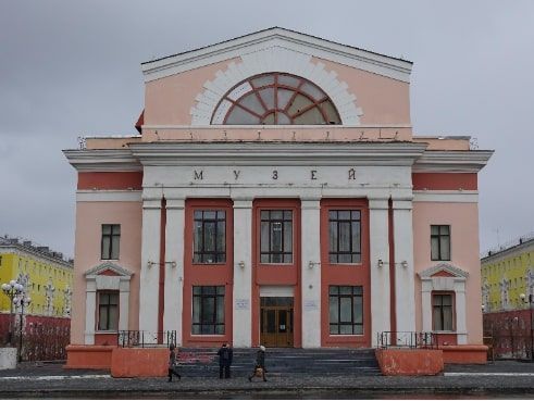1. Градостроительные характеристики1.1. Местоположение объекта в системе городской застройкиОбъект расположен в историческом центре г. Норильска, на Ленинском проспекте, в квартале, ограниченном ул. Павлова, ул. Богдана Хмельницкого, Ленинским проспектом и ул. Пушкина.1.2. Композиционная значимостьОбъект входит в состав ансамбля застройки центра г. Норильск. Главным (юго-западным) фасадом объект обращен на Ленинский проспект. Формирует северо-восточную линию застройки Ленинского проспекта. 1.3. Габариты и силуэтГабаритные размеры здания в плане (42,26 х 25,19 м), высотные отметки до конька крыши на 1960 г. 1.4. Секторы и направления видовых раскрытий, визуальные связи объектаОбъект раскрывается: с Комсомольской площади, при движении по Ленинскому проспекту; от перекрестка Ленинского проспекта с ул. Богдана Хмельницкого до Гвардейской площади; изнутри (из средней части) квартала.2. Архитектурные и конструктивные характеристики2.1. Объемно-пространственная композиция на дату строительства (1960 г.)Здание четырехэтажное, прямоугольное в плане, симметричное относительно продольной оси, с выделенным валиком цоколем. Центральный объем здания самый высокий, четырехэтажный, вытянут вдоль продольной оси, его крыша двухскатная (со скатами на северо-запад и юго-восток). Боковые объемы, примыкающие к центральному, – пониженные, трехэтажные, с плоскими крышами.Главная входная группа расположенна с юго-западной стороны, оформлена широким порталом.2.2. Композиция и архитектурно-художественное оформление фасадов на дату строительства (1960 г.)2.2.1. Юго-западный фасадКомпозиция фасадаФасад симметричен относительно центральной оси, решен в 5 оконных осей по второму этажу. На первом этаже трем центральным осям соответствуют дверные проемы (переоборудованы в оконные проемы), двум боковым – оконные проемы.Трехосный портал выполнен в виде ризалита, представляет собой ряд пилястр, расположенных по бокам проемов, имитирующих колонны (по углам ризалита – сдвоенные пилястры).Выше пилястр по всему фасаду проходит широкий антаблемент с архитравом, гладким фризом и многообломным карнизом большого выноса. Над антаблементом проходит парапет, над парапетом – фронтон с треугольным завершением, крупной полукруглой нишей в центре и карнизом небольшого выноса.Простенки между пилястрами ризалита слегка заглублены. Оконные проемы ризалита по осям 2-й, 3-й и 4-й более крупные, чем другие окна фасада. Окна первого этажа на первой и 5-й осях акцентированы эдикулами. Все проемы прямоугольной формы.Перед входом – прямоугольное крыльцо на ширину ризалита с широкой лестницей в центре и выступами верхней площадки по бокам. Декоративное оформление фасада:горизонтальная рустовка пилястр;профилировка карнизов (сложная у карниза большого выноса);профилированные пояски пилястр, имитирующие капители;выступающий поясок по верху архитрава;выступающий поясок по верху парапета;архивольт, имитирующий разновеликие клинчатые камни, обрамляющий полукруглую нишу фронтона;эдикулы, представляющие собой композицию, включающую в себя следующие элементы: широкие наличники с широкими кронштейнами и узким подоконным поясом, имитирующие колонны; перемычку с крупным веерным трехчастным клиновидной формы замковым камнем, расположенную между кронштейнами и по высоте равную им; треугольн