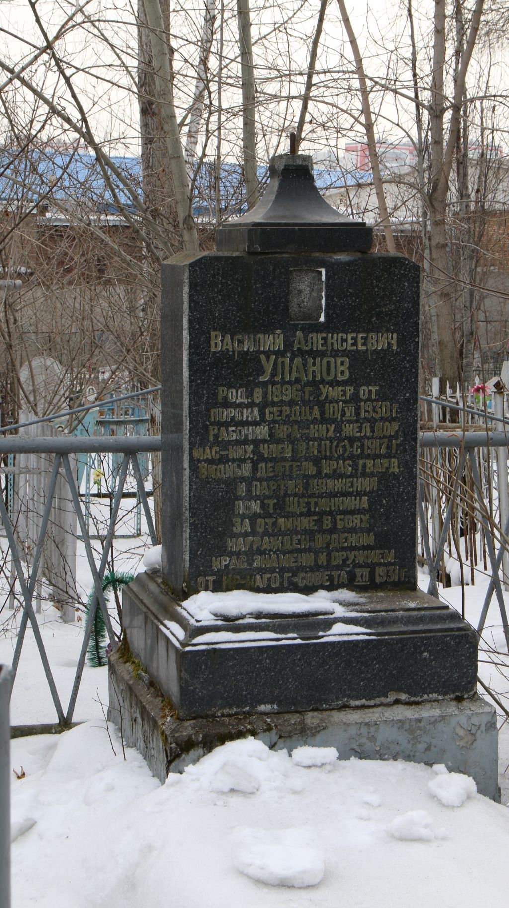 1. Местонахождение памятника:Николаевское кладбище г. Красноярска, северо-восточная часть сектора 1, южнее центральной аллеи, на расстоянии около 40 метров от входа.2. Захоронение (могила) в полном объеме:захоронение тела (останков) человека.3. Надгробное сооружение3.1. Тип памятника:стела в форме прямоугольного параллелепипеда со скошенными верхними углами, завершенная подставкой с металлическим шаром, к шару крепилась звезда на металлическом штыре (звезда и шар утрачены). В основании стелы трехступенчатый постамент.Размеры: первая ступень постамента 1,03 х 1,03 х 0,3 м, вторая ступень постамента 0,87 х 0,87 х 0,33 м, третья ступень постамента 0,79 х 0,79 х 0,25 м; стела 0,65 х 0,93 х 0,34 м; основание подставки 0,33 х 0,34 м, высота подставки 0,25 м; общая высота памятника до верхней точки подставки 2,05 м.3.2. Техника и материалы памятника:высекание по черному мрамору стелы и верхней ступени постамента, первая и вторая ступени постамента бетонные.3.3. Особенности обработки поверхности памятника:полировка мраморной стелы и верхней мраморной ступени постамента.3.4. Надписи с оригинальными названиями композиций и тексты, введенные в состав памятника:на фронтальной стороне плиты высеченная и окрашенная в золотистый цвет надпись: «Василий Алексеевич Уланов. Род. в 1896 г. Умер от порока сердца 10/VI 1930 г. Рабочий кра-ких жел. дор. мас-ких, член В.К.П.(б) с 1917 г. Видный деятель Крас, гвард. и партиз. Движения, пом. т. Щетинкина. За отличие в боях награжден орденом Крас. Знамени и оружием, от Кр-каго г-совета XII 1931 г.».4. Историческое (мемориальное) значение:памятник революционеру, участнику гражданской войны Уланову В.А.После окончания Красноярского железнодорожного училища Уланов В.А. был направлен работать учеником слесаря в Красноярские железнодорожные мастерские. В рядах красноярских железнодорожников он впоследствии стал революционером. Во время Февральской революции 1917 г. он вел активную пропагандистскую работу, тогда же Уланов В.А. был принят в партию. Красноярским партийным комитетом был назначен инструктором по обучению отрядов Красной гвардии. Во время белочешского мятежа Уланов В.А. сражался на Клюквинском фронте. После установления колчаковского режима перешел на подпольную работу. В ноябре 1918 г. по заданию Красноярского подпольного партийного комитета был послан в Ачинский уезд для организации подпольных партийных групп по подготовке вооруженного восстания против интервентов. Первый партизанский отряд был создан в с. Конторино под руководством Е.Т. Марутко и П.Е. Щетинкина. Уланов В.А. был избран помощником командира отряда, затем он становится командиром батальона. Его кавалерия была главной ударной частью основных соединений. Во время легендарного перехода армии Кравченко и Щетинкина из Степного Баджея через Саянский хребет в Урянхайский край отряд кавалерии Уланова в числе 150 всадников шел в авангарде колонны партизан. В составе армии Кравченко и Щетинкина отряд Уланова В.А. прошел весь боевой путь от с. Конторино Ачинского уезда до Степного Баджея, отсюда до Белоцарска, Минусинска, Ачинска и Красноярска.После разгрома войск Колчака Уланов В.А. по призыву партии формировал из доброволыдев-партизан боевые отряды, которые отправлялись на Западный фронт. Отряды сражались против Врангеля и белополяков. После возвращения в Красноярск Уланов В.А. был назначен на