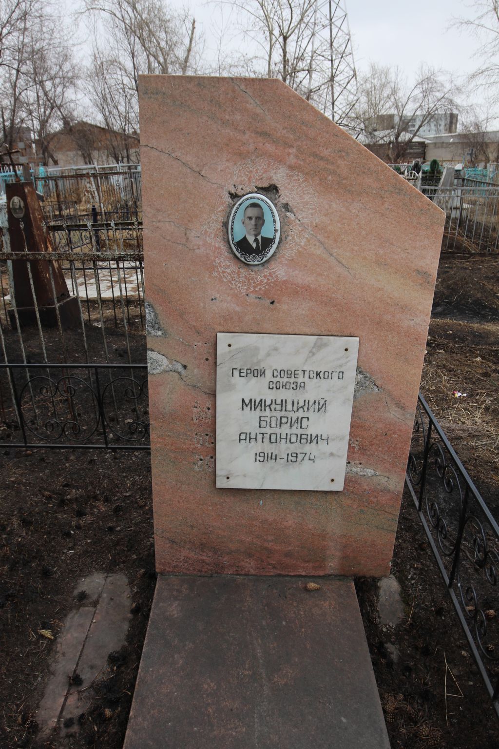 1. Местонахождение памятника:юго-восточная часть Троицкого кладбища г. Красноярска, центральная часть сектора № 9.2. Захоронение (могила) в полном объёме:захоронение тела (останков) человека.3. Историческое (мемориальное) значение:памятник истории, связанный с именем гвардии старшего сержанта Героя Советского Союза Микуцкого Бориса Антоновича (1914–1974), отличившегося при форсировании Днепра и в боях за плацдарм.Микуцкий Б.А. отличился 29 сентября 1943 г. при форсировании Днепра в районе села Куцеволовка (Онуфриевский район Кировоградской области) в боях за плацдарм. При форсировании реки он переправился вместе с разведкой, изыскал пути для батареи, и она форсировала Днепр своевременно и без потерь. Когда батарея с ходу развертывалась для отражения контратаки, Микуцкий быстро выдвинулся с полкового наблюдательного пункта (ПНП) в боевые порядки нашей пехоты и все дни боёв находился там, корректировал огонь, отражал контратаки.После усиленной артподготовки 5 октября 1943 года немцы предприняли контратаку при поддержке танков и авиации. Отдельные танки с десантом вклинились в нашу оборону, автоматчики наседали на ПНП. Оставшись один, Микуцкий вызвал огонь батареи на себя, сам начал точно корректировать огонь по вражеской пехоте и отрезал её от танков, чем обеспечил нашей пехоте переход в контрнаступление и захват после ожесточенных боев населенных пунктов и укреплённого района врага.Звание Героя Советского Союза присвоено Указом Президиума Верховного Совета СССР от 22 февраля 1944 г.Награждён орденами Ленина, Красной Звезды, Трудового Красного Знамени, медалями.