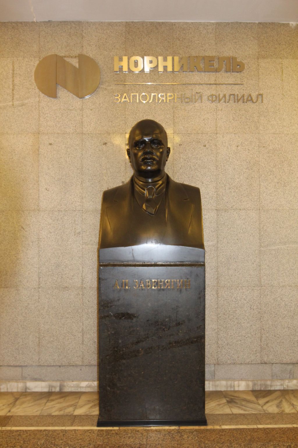 1. Градостроительные характеристики1.1. Местоположение объекта в системе городской застройкиОбъект находится в г. Норильске, в фойе главного административного здания ЗФ ОАО «ГМК «Норильский никель» (площадь Гвардейская, 2).2. Памятник2.1. Тип памятникаПамятник представляет собой бюст Завенягина Авраамия Павловича на усеченном постаменте в форме прямоугольного параллелепипеда. Габариты: высота скульптуры – 2,59 м, размеры скульптуры в основании – 0,92 x 0,7 м.2.2. Техника и материалы памятникаБюст выполнен из черного камня. 2.3. Дополнительные элементы оформленияВ верхней части постамента выгравирована надпись: «А.П. Завенягин».3. Историческое (мемориальное) значениеПамятник, связанный с именем А.П. Завенягина, основателя Норильского горно-металлургического комбината и города Норильска.4. Художественная ценностьПамятник советского монументального искусства, создан в 1960 году.