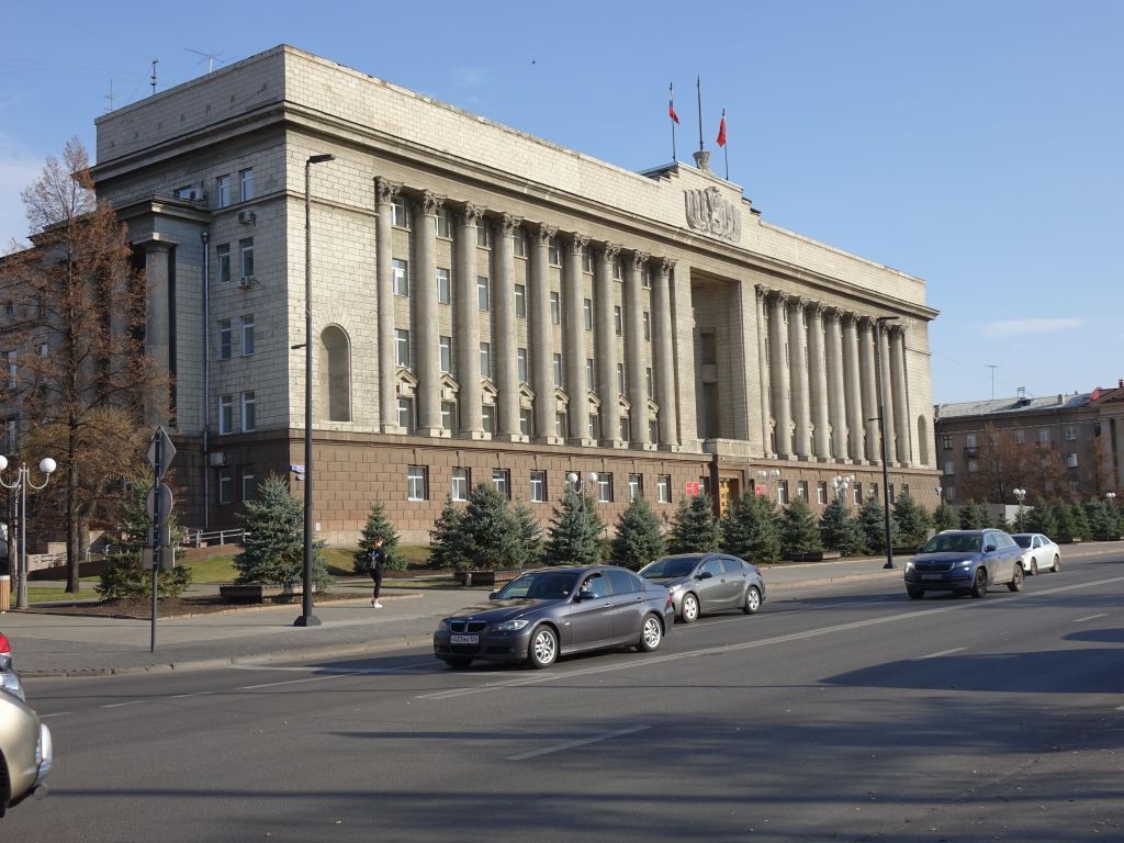 1. Местоположение, роль и градостроительные характеристики зданияОсновной объект ансамбля площади Революции, оформляет её северный фасад. Симметричная композиция главного фасада закрепляет планировочную ось, в створе которой находятся памятник В.И. Ленину, центральная аллея городского парка.2. Объёмно-пространственная композиция зданияОбразец крупного административного здания, выполненного в стиле советской неоклассики, Ш-образное в плане, состоит из четырёх прямоугольных корпусов. Главный, широтной ориентации протяжённый корпус коридорной планировки поднят на подсыпке, имеет высоту пять этажей и завершён глухим аттиком по всему периметру здания. Три северных корпуса, объединённых переходами, образуют два замкнутых двора.3. Южный фасад3.1. Композиция фасада на начало 1950 гг.Фасад симметричный, решён в семнадцать оконных осей.Центральная ось отмечена полукруглой нишей в четыре этажа, порталом главного входа и глухим ступенчатым аттиком.На стилобате первого этажа расположена массивная колоннада.По флангам корпуса глухие простенки оформлены посередине большими экседрами.В меридианальном направлении расположена широкая каменная двухмаршевая лестница.3.2. Декоративное оформление фасада на начало 1950 гг.:восемнадцать колонн на прямоугольных базах в формах коринфского ордера;стены всего фасада оштукатурены под руст крупными блоками сперевязкой в виде цепной кладки, на стенах цокольного и первого этажей руст крупнее;оконные проёмы прямоугольной формы одного размера;окна второго этажа оформлены профилированными рамочными наличниками и сандриками треугольной формы с массивным замком по центру;лепной картуш на аттике в виде герба, обрамлённого склонёнными знамёнами;перспективный портал главного входа с филёнчатой двухпольной дверью и стеклянной фрамугой с декоративными накладками;флагшток в форме пшеничного снопа;профилированный карниз значительного выноса по всему зданию.4. Западный фасад4.1. Композиция фасада на начало 1950 гг.Фасад асимметричный, решён в четырнадцать оконных осей.Западный фасад главного корпуса выше протяжённого в четыре этажа северного административного корпуса в девять оконных осей.На стилобате первого этажа установлен четырёхколонный портик.В широтном направлении расположена каменная двухмаршевая лестница.4.2. Декоративное оформление фасада на начало 1950 гг.:четыре колонны в формах дорического ордера с антамблементом формируют портик над входом западного фасада главного корпуса;стены всего фасада оштукатурены под руст крупными блоками с перевязкой в виде цепной кладки, на стенах цокольного и первого этажей руст крупнее;оконные проёмы прямоугольной формы двух размеров;по двум осям западного фасада главного корпуса проёмы по ширине меньше;окна третьего этажа через одно оформлены профилированными рамочными наличниками и сандриками треугольной формы с массивным замком по центру;межэтажный профилированный карниз под аттиком;чередующийся рисунок прямоугольных и круглых ниш по стенам аттика;профилированный карниз значительного выноса по всему зданию.5. Восточный фасад5.1. Композиция фасада на начало 1950 гг.Фасад асимметричный‚ решён в четырнадцать оконных осей.Восточный фасад главного корпуса выше протяжённого в четыре этажа северного административного корпуса в девять оконных