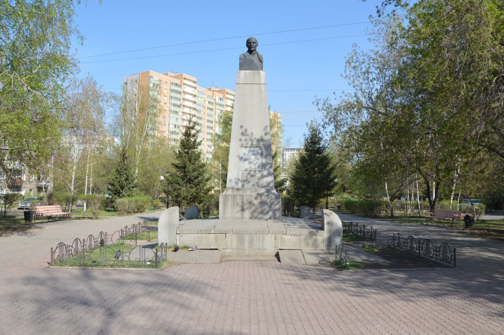 1. Местоположение:г. Красноярск, Ленинский район, пр. имени газеты «Красноярский рабочий», между домами № 74а и № 72а, в сквере, ведущем от пр. имени газеты «Красноярский рабочий» к Правобережному городскому Дворцу культуры.2. Градостроительные характеристики:композиционное ядро сквера, ведущего от пр. имени газеты «Красноярский рабочий» к Правобережному городскому Дворцу культуры.3. Техника и материалы скульптуры и постамента:бюст – литьё из бронзы, постамент – высекание, резьба по светлому граниту.4. Конструктивные особенности и составные части памятника.Объёмная композиция в виде бюста В.И. Ленина, отлитого из бронзы, на 2-ступенчатом 4-гранном постаменте из глыб светлого гранита (1-я ступень в форме параллелепипеда, 2-я – с трапециевидными сторонами). В основании постамента стилобат в форме параллелепипеда, сложенный из блоков светлого гранита. По углам стилобата 4-гранные столбики из светлого гранита, три грани которых имеют овальные завершения. К стилобату по углам примыкают покатые плиты, а по центру каждой из сторон плиты в форме параллелепипеда, также из светлого гранита. Размеры: высота бюста 0,80 м; высота 1-й ступени постамента0,80 м, площадь основания 4,95 м х 4,95 м; высота 2-й ступени 3,05 м, площадь основания 1,20 м х 1,20 м; высота столбиков 1,00 м.5. Особенности обработки поверхности памятника:вытравка текста надписи, шлифовка поверхностей постамента и стилобата.6. Тематика памятника:бюст В.И. Ленина выполнен в ясных, выразительных и лаконичных формах.7. Надписи с оригинальными названиями композиций и тексты, введенные в состав памятника:на фасадной (юго-восточной) стороне 2-й ступени постамента мемориальная металлическая доска (0,66 м х 0,70 м) с надписьюиз металлических знаков: «Владимир Ильич Ленин 22 21 18 – 70 19 – 24 IV I»;в трёх метрах от лицевой стороны памятника на бетонном блоке мемориальная металлическая доска с надписью из металлических знаков: «Памятник В.И. Ленину сооружен на средства трудящихся города Красноярска в 1924 г. В честь столетия со дня рождения В.И. Ленина решением исполкома городского Совета депутатов трудящихся памятник передан Ленинскому району».8. Авторство: советский скульптор С.Д. Меркуров и красноярский архитектор Л.А. Чернышёв.9. Историческое (мемориальное) значение:памятник вождю Великой Октябрьской социалистической революции В.И. Ленину.10. Художественная ценность:типичный образец памятника В.И. Ленину советского периода.