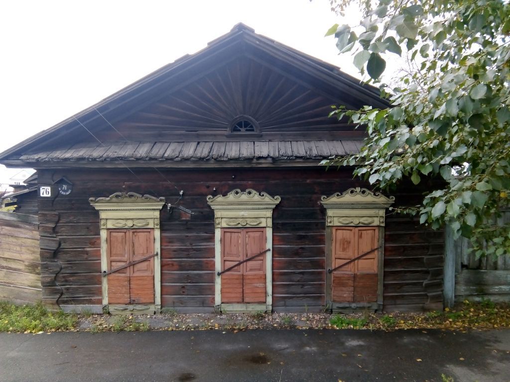 III. Флигель жилой (ул. Ленина, 76) 1. Градостроительные характеристики1.1. Местоположение зданияОбъект расположен по северной стороне ул. Ленина на территории квартала, ограниченного ул. Ленина, ул. Ванеева, ул. Лазо и ул. Доброва. Занимает среднее положение в комплексе. Ворота с калиткой расположены с западной стороны здания.1.2. Композиционная значимостьЗдание участвует в формировании северной линии застройки ул. Ленина.1.3. Габариты и силуэтОбщие размеры дома в плане 11,8 х 8,0 м.1.4. Секторы и направления видовых раскрытий, визуальные связи памятникаОбъект раскрывается с участка ул. Ленина, ограниченного ул. Ванеева и ул. Доброва.2. Архитектурные и конструктивные характеристики2.1. Объемно-пространственная композиция на дату строительства (кон. ХIХ в.)Объект представляет собой одноэтажное, вытянутое в глубину участка здание. 2.2. Конструкция крыши на дату строительства (кон. ХIХ в.)Крыша двускатная, кровля тесовая.Трубы дымоудаления, выходящие на крышу.2.3. Композиция и архитектурно-художественное оформление фасадов на дату строительства (кон. ХIХ в.)2.3.1. Южный фасад Композиция фасадаФасад симметричный, решен в три оконных оси, завершен треугольным фронтоном с карнизным выносом под свесом кровли. Фронтон от первого этажа отделяет карниз с дощатым фризом, крытый тесом. В центре фронтона, в нижней части, расположено небольшое полукруглое слуховое окно. Углы фасада обработаны рустом криволинейных очертаний.Декоративное оформление фасадаПрофилировка карнизных выносов.Окна обрамлены наличниками с профилированными сандриками, декорированными порезкой геометрического характера. Лобани украшены прямоугольными филенками с накладной резьбой простого рисунка в центре и накладной резьбой солярного рисунка по флангам. Очелья прорезные, встречной волнообразной формы, с центральным венчающим элементом в виде сердечка. Низ наличника криволинейного очертания, украшен накладной резьбой простого рисунка. Свесы с филенками декорированы накладными резными элементами солярного рисунка.Обшивка тимпана выполнена радиально расходящимися от слухового окна лучами.2.3.2. Западный фасадКомпозиция фасадаФасад решен в одну оконную ось (в южном углу фасада) и одну ось дверного проема, расположенного между двумя центральными перерубами стен, завершен карнизом и дощатым фризом.Южный угол фасада обработан рустом криволинейных очертаний.Декоративное оформление фасадаПрофилировка карнизного выноса.Окно обрамлено наличником с профилированным сандриком, декорированным порезкой геометрического характера. Лобань украшена накладной резьбой в виде двух сходящихся в центре дуг с порезкой растительных форм, с накладной резьбой солярного рисунка по флангам и в центре (такие же накладки расположены под дугами в поле лобани). Свесы радуг украшены кистями. Очелье прорезное, встречной волнообразной формы с центральным венчающим элементом в виде сердечка. Низ наличника криволинейного очертания, украшен накладной резьбой простого рисунка. Свесы с филенками декорированы накладными резными элементами солярного рисунка.2.3.3. Северный фасадКомпозиция фасадаКомпозиция фасада симметричная. Фасад решен в три оконных оси, завершен треугольным фронтоном с карнизным выносом под свесом кровли. Фронтон от первого этажа отделяет карниз с дощатым фризом, крытый тесом. В 