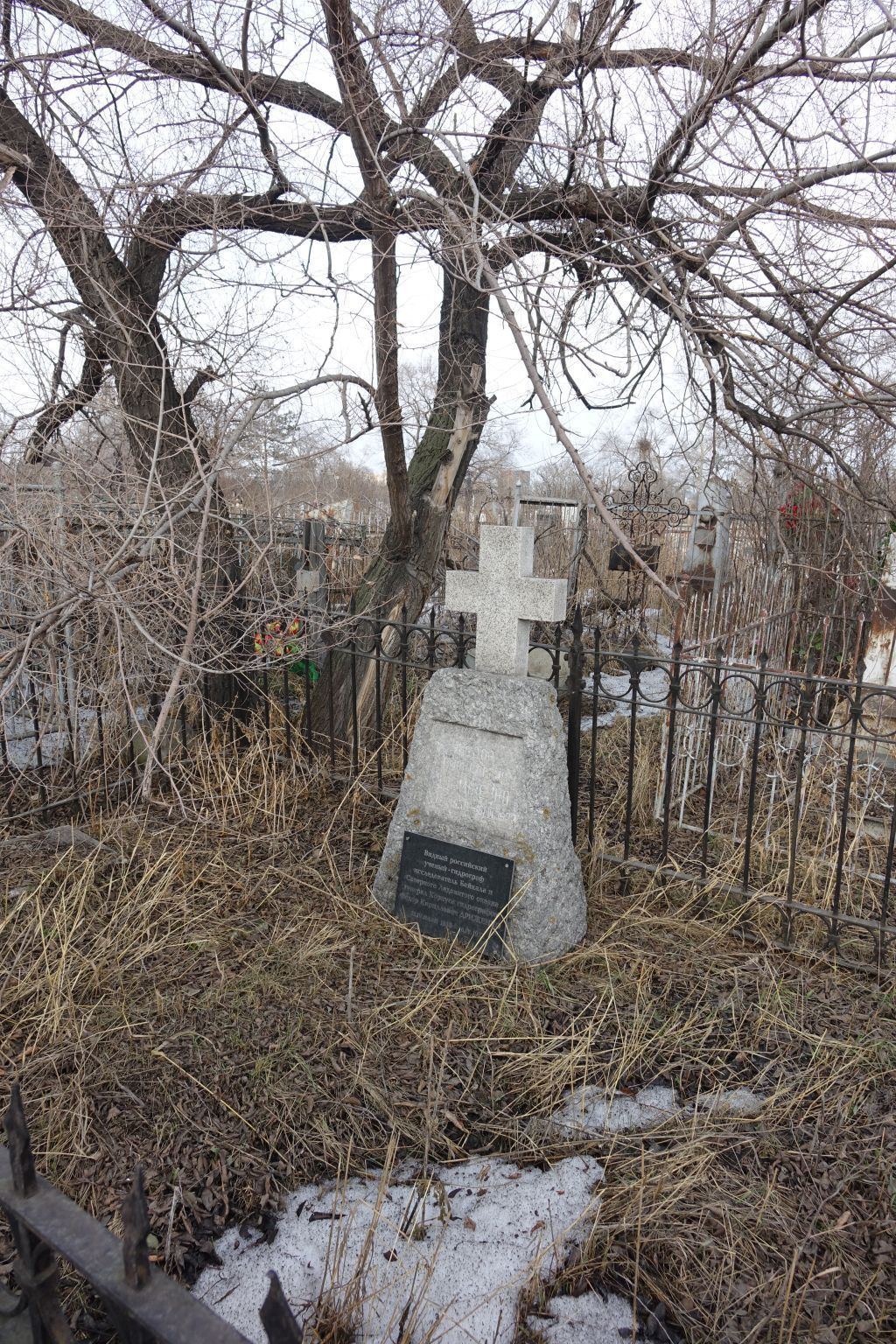 1. Местонахождение памятника:Троицкое кладбище г. Красноярска, южная часть сектора № 4.2. Захоронение (могила) в полном объёме:захоронение тела (останков) человека.3. Надгробное сооружение3.1. Тип памятника: надмогильное сооружение представляет собой глыбу кварцита, грубо обработанного в форме четырёхгранника неправильной формы. Надгробие завершает крест, выполненный из серого гранита (установлен после 1989 г.). Размеры: высота надгробия 0,80 м, площадь сечения у основания 0,60 х 0,40 м, площадь сечения верхней части 0,30 х 0,26 м, высота креста 0,40 м, общая высота памятника от основания до верхней точки креста 1,20 м. 3.2. Техника и материалы памятника:высекание по кварциту.3.3. Особенности обработки поверхности памятника: надгробие имеет фактуру, соответствующую природному камню, крест, завершающий надгробие, шлифован и полирован.3.4. Ограда памятника: могила Ф.К. Дриженко, совместно с соседними захоронениями С.Г. Дриженко и С.Л. Дриженко), ограждена фигурной металлической кованой оградой, окрашенной в чёрный цвет. Прутья ограждения имеют копьевидное завершение. Верхняя часть ограды представляет собой пояс из колец, вписанных в квадраты, образованные пересечением вертикальных прутьев и горизонтальных полос. Аналогичный пояс проходит по низу ограды. Вход на территорию захоронения расположен с южной стороны.Размеры ограды: высота 0,70 м, длина южного участка 2,59 м, длина западного участка 3,55 м, длина северного участка 2,45 м, длина восточного участка 3,54 м.3.5. Надписи с оригинальными названиями композиций и тексты, введённые в состав памятника:в неглубокой нише центральной части памятника высечена и окрашена в золотистый цвет надпись: «Федор Кириллович Дриженко 22/IV 1858 – 16/IV 1922». Ниже высеченной надписи мемориальная доска следующего содержания: «Видный российский учёный-гидрограф, исследователь Байкала и Северного Ледовитого океана, генерал Корпуса гидрографов Федор Кириллович ДРИЖЕНКО 22.IV.(04.05)1858 – 16.IV.1922» (установлена после 1989 г.).4. Историческое (мемориальное) значение:памятник, связанный с именем русского советского гидрографа-геодезиста Дриженко Фёдора Кирилловича, внёсшего существенный вклад в развитие гидрографической науки. Дриженко Ф.К. (22.04.1858 – 16.04.1922) родился в Одессе. В 1874 году окончил гимназию и поступил в Санкт-Петербургское морское училище, которое окончил в 1877 г. С 1878 по 1883 г. совершил кругосветное плавание. С 1884 по 1886 г. обучался в Николаевской морской академии (гидрографическое отделение). С 1887 по 1889 г. прослушал в Главной астрономической обсерватории в Пулково курс практической астрономии и геодезии. В 1888 г. публично защитил диссертацию в Николаевской морской академии по теме «Развитие морских угломерных инструментов и исследование жироскопа-коллиматора Флерье». Дважды был командирован в Европу с целью изучения состояния гидрографии.Возглавлял работы по гидрографической съёмке Онежского озера (1891–1894 гг.), гидрографическую экспедицию на озеро Байкал (1897–1903 гг.), где проводил серию магнитных измерений и астрономических наблюдений. С 1903 г. работал в области изучения русского Севера, был начальником Гидрографической экспедиции на Северный Ледовитый океан (1903–1905 гг.), начальником отдельной съемки Белого моря (1905–1908 гг.). В 1908–1912 годах он помощник начальника Главного гидрографического управления, в 1912 г. – начальник отдельной съёмки 