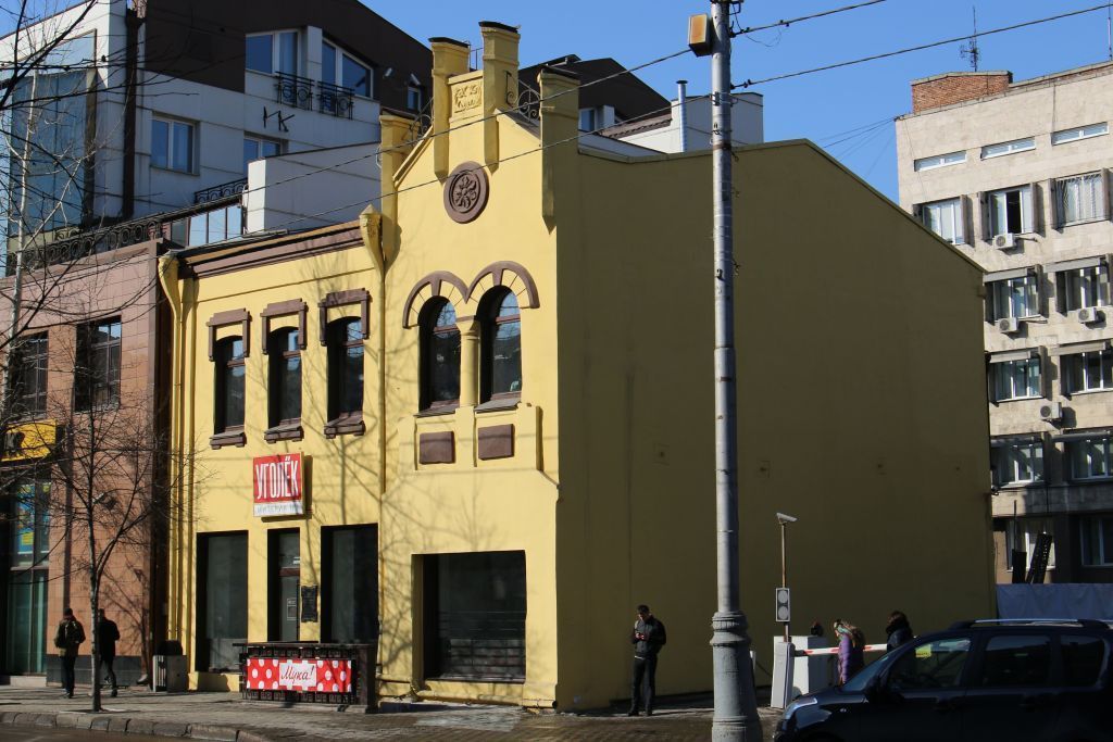 1. Градостроительные характеристики1.1. Местоположение объекта в системе городской застройкиРасположен в историческом центре, на пр. Мира на линии застройки, в границах квартала, образованного пересечением пр. Мира, ул. Сурикова, ул. Ленина, ул. Вейнбаума. 1.2. Композиционная значимостьЗдание формирует участок застройки северной стороны пр. Мира.1.3. Габариты и силуэтГабариты и высотные отметки здания до конька кровли на дату строительства (кон. XIX в.).1.4. Секторы и направления видовых раскрытий, визуальные связи памятникаРаскрытие памятника и восприятие с южной, юго-западной, юго-восточной сторон пр. Мира, ограниченного ул. Сурикова и ул. Вейнбаума, и с территории двора, прилегающего с восточной стороны к памятнику.2. Архитектурные и конструктивные характеристики2.1. Объёмно-пространственная композиция на кон. XIX в.Небольшой двухэтажный дом с подвалом. Г-образный в плане основной объём здания удлинён с севера вытянутой лестничной пристройкой. Проезд во двор размещён в ризалите главного фасада, вдоль восточной торцевой стены. Главный вход расположен на центральной оси южного фасада. 2.2. Конструкция крыши на кон. XIX в.Крыша сложной формы с железной под окраску кровлей по деревянным стропилам и обрешётке. Дополнительные скаты образованы над ризалитом центрального фасада и дворовым выступом. Трубы, выходящие на крышу, с фигурными кровельными элементами. 2.3. Композиция и архитектурно-художественное оформление фасадов на кон. XIX в.:2.3.1.Южный фасадКомпозиция фасадаФасад асимметричный, решён в пять осей оконных проёмов на втором этаже. С восточной стороны фасада расположен ризалит с двумя полуциркульными оконными проёмами на втором этаже, завершённый трапециевидным щипцом с четырьмя фиалами и карнизом малого выноса.На первом этаже фасад решён в четыре оси проёмов, на первой и 3-ей осях которого расположены прямоугольные окна витринного типа (больше остальных окон фасада в ширину и высоту), на 2-ой – дверной проём прямоугольной формы, на 4-ой – арочный проём (с лучковой перемычкой) проезда во двор.Окна второго этажа на первой, 2-ой и 3-ей осях имеют лучковые перемычки. Западный угол фасада обработан широкой, плоской лопаткой.В западной части фасад завершён профилированным карнизом малого выноса с плоским фризом, раскрепованными на лопатке. Декоративное оформление фасада:кованое металлическое ограждение парапета; лепная филёнка растительного рисунка и декоративная лучковая перемычка с веерным замком и лепной розеткой растительного рисунка, расположенные в верхней части щипца между двумя фиалами;широкие рустованные архивольты, опирающиеся в межоконном простенке на ¾ полуколонну, обрамляющие окна второго этажа ризалита;подоконные тумбы окон ризалита с лежачими филёнками в простенках между ними, выполненными как «бриллиантовый» руст; подоконные полочки и прямоугольные сандрики со стилизованными кронштейнами окон второго этажа.2.3.2. Восточный фасадКомпозиция фасадаГлухая стена фасада завершена щипцом. С севера фасад удлинён стеной лестничной пристройки с двумя осями проёмов, на первой из которых расположен дверной проём, на второй (в уровне второго этажа) – оконный. Все проёмы имеют лучковые перемычки. Лестничная пристройка завершена плоским карнизом малого выноса.2.3.3. Северный фасадКомпозиция фасадаФасад асимметричный с выступ