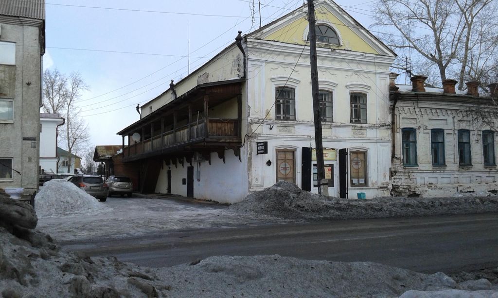 1.Местоположение, роль и градостроительные характеристики зданияЗдание расположено по северной стороне ул. Ленина, рядом с примыкающим к нему с востока домом Макарова (ул. Ленина, 110), на краю участка с утраченными усадебными границами. 2.Объёмно-пространственная композиция зданияКирпичное двухэтажное, прямоугольное в плане, с подвалом (под основной, южной частью здания) и третьим антресольным этажом здание, покрытое двускатной крышей. Объёмом, вытянутым вглубь квартала, здание напоминает древнеримскую «инсулу». Общие размеры здания – 8,71 х 24,5 м.3.Внутренняя планировка зданияВнутреннее пространство разделено поперечными капитальными стенами на четыре разновеликих помещения. Вход в помещение бывшей лавки расположен на главном фасаде; помещение, сообщающееся с лавкой, имеет выход на западном фасаде. Два помещения, расположенные одно за другим в северной части первого этажа, имеют отдельные входы. На второй этаж можно попасть по наружной лестнице, ведущей на галерею. На втором этаже в помещении, выходящем тремя окнами на юг, располагалась жилая комната с сенями; два других помещения второго этажа, в которые вели входы с галереи, имели складское назначение. Третий, антресольный этаж целиком использовался под склад, в него вела крутая одномаршевая лестница со второго этажа.4.Колористическое решение зданияОштукатуренные фасады окрашены известковыми красками в два цвета: бежевый – поле стены, белый – карниз, междуэтажные пояса, пилястры, сандрики, лепной декор. Оконные переплёты и дверные заполнения окрашены масляными красками. Кровля, подоконные сливы, элементы водосточной системы и металлические кровельки деталей фасадов окрашены в красно-коричневый цвет. В интерьере стены, потолки, штукатурные тяги окрашены известковыми красками в белый цвет и светлые колерованные тона.5.Условия зрительного восприятияСтвор ул. Ленина – от перекрестка с ул. Горького до ул. Диктатуры Пролетариата.6. Южный фасад6.1. Композиция фасада 2-й половины XIX векаКомпозиционно фасад имеет активно воспринимаемые горизон-тальные членения: раскрепованный по пилястрам мелкопрофилированный венчающий карниз с фризом, отделённым полочкой с выкружкой; раскрепованный по пилястрам междуэтажный пояс из двух профилированных тяг; под окнами первого этажа полуваликом, раскрепованным по пилястрам, отделена цокольная часть. Композиция фасада симметричная, в три оси проёмов (вход расположен по центральной оси первого этажа, в остальных осях расположены оконные проёмы). Углы обработаны широкими пилястрами, декорированными филёнками. Проёмы имеют перемычки лучкового очертания. Фасад завершён треугольным фронтоном с полуциркульным окном в тимпане.6.2. Декор южного фасада 2-й половины XIX века:междуэтажный пояс, декорированный под оконными проёмами «лежачими» филёнками с симметричным лепным декором растительного характера, расположенным в поле филёнок;мелкопрофилированные тяги, обрамляющие окна первого этажа, опирающиеся на подоконный пояс;мелкопрофилированные тяги, обрамляющие окна второго этажа, опирающиеся на межэтажный пояс;профилированные сандрики лучкового очертания с зубчатыми фестонами по верху, помещённые над окнами второго этажа;лепные тройные гирлянды, украшенные кистями, помещённые над сандриками окон второго этажа;угловые пилястры, украшен