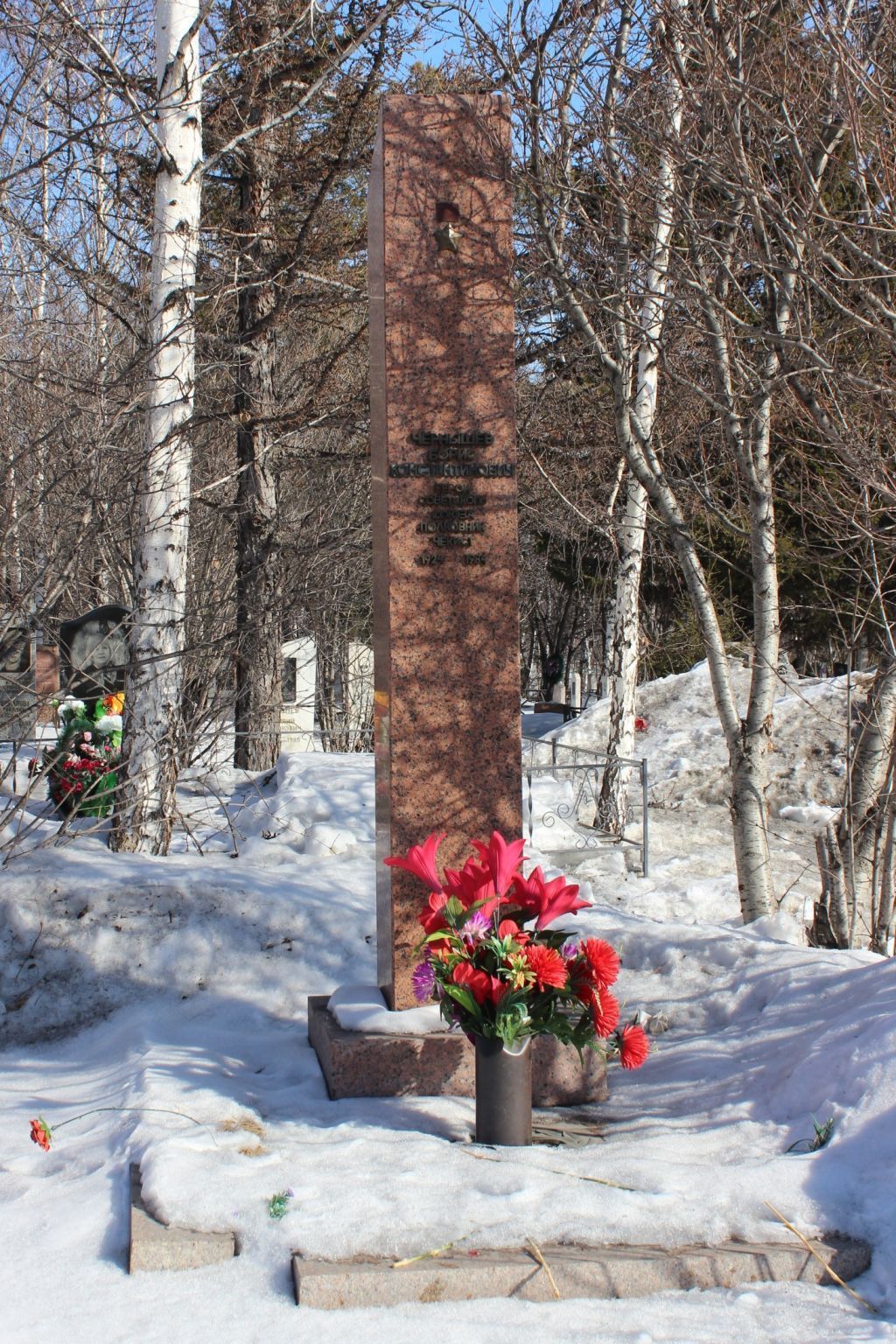 1. Местонахождение объекта:кладбище «Бадалык» г. Красноярска, Аллея почетных захоронений.2. Захоронение (могила) в полном объеме:захоронение тела (останков) человека. 3. Историческое (мемориальное) значение:памятник, связанный с именем Героя Советского Союза Чернышева Бориса Константиновича (1924–1984).Борис Чернышев прошел боевой путь от берегов Дона до реки Одер. Принимал участие в боях на Курской дуге, форсировании Дона, в битве за Киев, Тернополь, в форсировании рек Висла и Одер, в Корсунь-Шевченковской операции, в боях на Сандомирском плацдарме, освобождении городов: Воронежа, Курска, Харькова, Тернополя, Львова, Праги.Чернышев Б.К. отличился 27 января 1945 г. в боях на Одерском плацдарме в районе г. Прейсдорф (Германия). На плацдарме за Одером свыше батальона пехоты гитлеровцев при поддержке самоходных орудий и бронетранспортеров предприняли контратаку на боевые порядки батареи гвардии капитана Чернышева, которая приняла огневой удар. Без прикрытия пехоты артиллеристы в течение четырех с половиной часов отбивали вражеские контратаки. Когда на фланг батареи прорвались немецкие автоматчики, а пулеметчик, прикрывавший этот участок, был ранен, в этой критической ситуации капитан Чернышев сам лег за пулемет и отбил две неприятельские атаки, воодушевив тем самым личный состав на выполнение боевой задачи. Батарея удержала занимаемый рубеж. Все атаки противника были отбиты.В этом бою батарея Бориса Чернышева сожгла два самоходных орудия и уничтожила до трех десятков гитлеровцев. Всего на боевом счету батареи числился двадцать один сожженный танк, четыре самоходных орудия, девять разбитых орудий и свыше четырехсот фашистских солдат и офицеров.Звание Героя Советского Союза присвоено Указом Президиума Верховного Совета СССР от 10 апреля 1945 г. Награжден орденом Ленина, двумя орденами Красного Знамени, орденами Отечественной Войны 2-й степени, Трудового Красного Знамени, Красной Звезды, медалями.