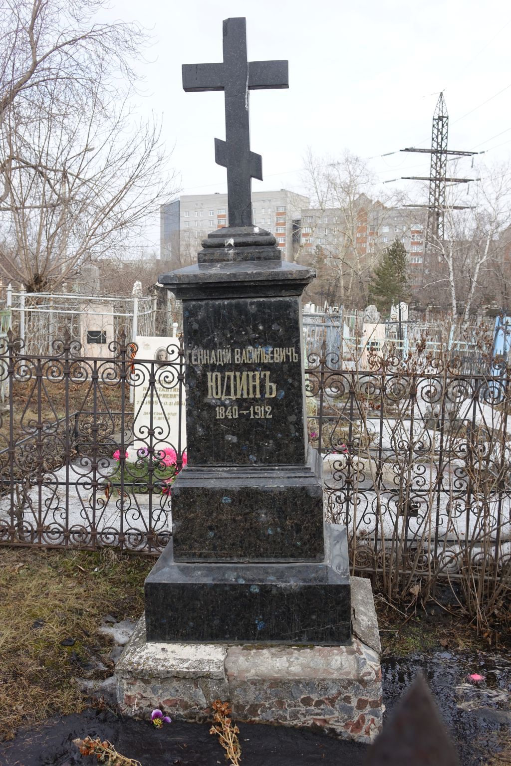 1. Местонахождение памятника:Троицкое кладбище г. Красноярска, восточная часть сектора № 1.2. Захоронение (могила) в полном объёме:захоронение тела (останков) человека.3. Надгробное сооружение3.1. Тип памятника: обелиск в форме прямоугольного параллелепипеда с фигурным завершением, установленным на трёхступенчатом основании, каждая ступень которого имеет форму прямоугольного параллелепипеда со скошенной верхней гранью. Памятник завершён православным крестом из чёрного мрамора на рельефной подставке.Размеры: общая высота памятника до завершения креста 2,60 м, высота креста 0,65 м; постамент 0,37 х 0,95 х 0,86 м; высота 1-й ступени 0,28 м, площадь основания 0,76 х 0,67 м; высота 2-й ступени 0,40 м, площадь основания 0,57 х 0,48 м; высота 3-й ступени 0,62 м, площадь основания 0,43 х 0,34 м.3.2. Техника и материалы памятника:постамент выполнен из оштукатуренного кирпича; памятник, включая завершающий его крест, высечен из чёрного мрамора.3.3. Особенности обработки поверхности памятника: полировка всех мраморных поверхностей памятника.3.4. Ограда памятника: могила, совместно с соседними захоронениями, по периметру окружена металлической кованой ажурного рисунка оградой с калиткой. Прутья ограды с копьевидными завершениями чередуются с рисунком в виде крупных завитков и гнутых линий, окрашены в чёрный цвет. Вход на территорию захоронения расположен с северной стороны. Размеры: южная сторона 3,66 м, западная сторона 8,43 м, северная сторона 3,78 м, восточная сторона 8,33 м.3.5. Надписи с оригинальными названиями композиций и тексты, введённые в состав памятника:с западной стороны в центральной части третьей ступени памятника надпись, выполненная краской золотистого оттенка: «Геннадiй Васильевичъ Юдинъ 1840–1912».4. Историческое (мемориальное) значение:памятник известному библиофилу Г.В. Юдину, создателю знаменитой библиотеки.Юдин Г.В. собирал литературу в России по всем разделам знаний: истории, географии, литературе, статистике, библиографии и т. д. На его средства начало выходить 25-томное издание «Русские книги» Венгерова (издано 3 тома), был издан ряд научных трудов по истории Сибири. Он организовал и финансировал составление «Материалов для истории г. Чухломы и рода костромичей Юдиных» (2-й том, Красноярск, 1902 г., а всего подготовлено 8 томов).Благодаря своей осведомлённости в книжном деле и связям, Юдин Г.В. приобрёл для библиотеки уникальные русские издания 18 века (например, сочинение М.В. Ломоносова «Полидор», в его книгохранилище находился один из уцелевших экземпляров первого издания «Путешествия из Петербурга в Москву» А.Н. Радищева, первое издание «Слова о полку Игореве»). Им были приобретены полные комплекты всех русских журналов 18 и начала 19 веков, масса запрещённых изданий. Так, например, Юдин купил 4 тысячи томов библиотеки историка М.П. Погодина, книги из собрания историка В.И. Семевского, большую часть библиотеки библиографа П.А. Ефремова. Помимо большого количества книг им был собран большой архив, содержавший рукописи Н. Гоголя, Л. Толстого, И. Тургенева, А. Островского, В. Жуковского и многих других. Юдин Г.В. обладал крупнейшим в дореволюционной России частным собранием рукописей и книг.В 1907 г. Г.В. Юдин продал свое собрание в 90 тысяч томов в США за 300 тысяч рублей золотом. Его коллекция составила основное ядро славянского отдела Библиотеки Конгресса США. Важно отметит