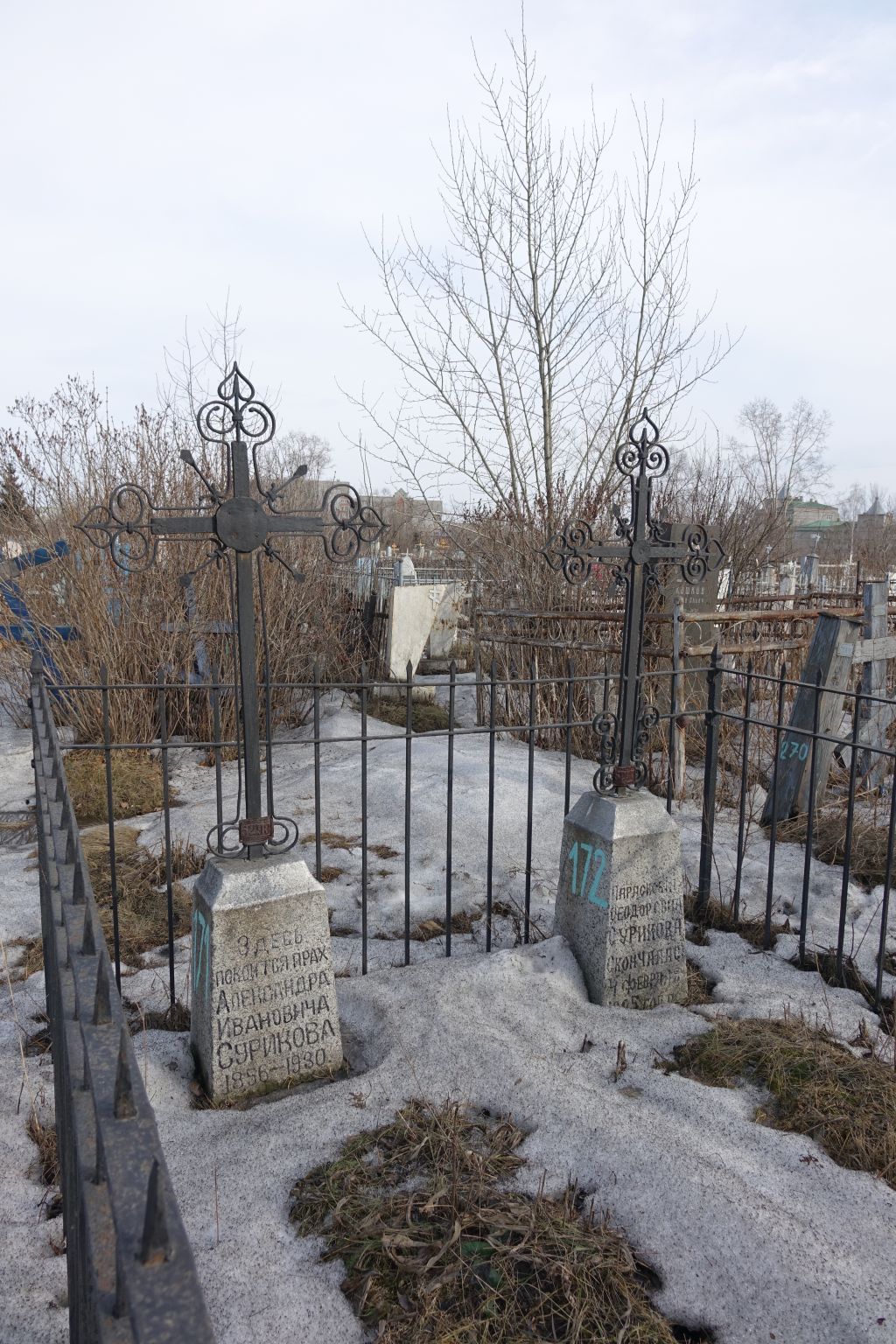 1. Местонахождение памятника:Троицкое кладбище г. Красноярска, северо-западный угол сектора № 3, на расстоянии около 40 м к северу от церкви, в одной оградке с могилой матери, П.Ф. Суриковой.2. Захоронение (могила) в полном объёме:захоронение тела (останков) человека.3. Надгробное сооружение3.1. Тип памятника:обелиск в форме усечённой пирамиды с трапециевидными сторонами, скошенными в верхней части, на бетонном постаменте в форме прямоугольного параллелепипеда. Надгробие венчает металлический ажурной ковки с геометрическими мотивами крест.Размеры: высота креста 1,26 м, обелиска 0,68 м; площадь основания обелиска 0,30 х 0,36 м; постамент 0,15 х 0,55 х 0,38 м.3.2. Техника и материалы памятника:высекание, резьба по граниту обелиска, постамент отлит из бетона.3.3. Особенности обработки поверхности памятника:все стороны и грани обелиска имеют гладкую шлифованную поверхность.3.4. Ограда памятника:могила, совместно с могилой матери, П.Ф. Суриковой, обнесена металлической кованой оградкой, прутья которой имеют копьевидное завершение. Вход на территорию захоронения расположен с западной стороны. Размеры ограды: высота 1,10 м, площадь 2,40 х 2,60 м.3.5. Надписи с оригинальными названиями композиций и тексты, введённые в состав памятника:на лицевой (западной) стороне обелиска высечена надпись: «Здесь покоится прах Александра Ивановича Сурикова 1856-1930».4. Историческое (мемориальное) значение: памятник, связанный с именем брата художника В.И. Сурикова. Суриков Александр Иванович (1856-1930) - родной брат великого русского художника В.И. Сурикова. Родился в Красноярске в казачьей семье. Род Суриковых был одним из старинных, упоминаемых начиная ещё с 17 века казачьих родов Красноярска. Учился в гимназии, затем в уездном училище, которое не окончил. Сдав экзамены на первый классный чин коллежского регистратора, служил в Красноярском губернском суде, где занимал должности столоначальника, протоколиста, секретаря суда, архивариуса. В 1911 г. вышел в отставку. Всю жизнь провел в Красноярске. Жил вместе с матерью, заботился о ней.Для Василия Ивановича Сурикова брат Александр был самым близким человеком. Свою любовь, тёплые чувства, дружеское отношение к нему живописец сохранил до конца своей жизни, о чём свидетельствуют его письма к брату. Суриков А.И. также с большой любовью и уважением относился к старшему брату, оказывал ему поддержку, когда художник потерял жену и тяжело переживал её смерть. Александр Иванович был инициатором написания художником картины «Взятие снежного городка». Суриков А.И. оставил ценные и тёплые воспоминания о брате.
