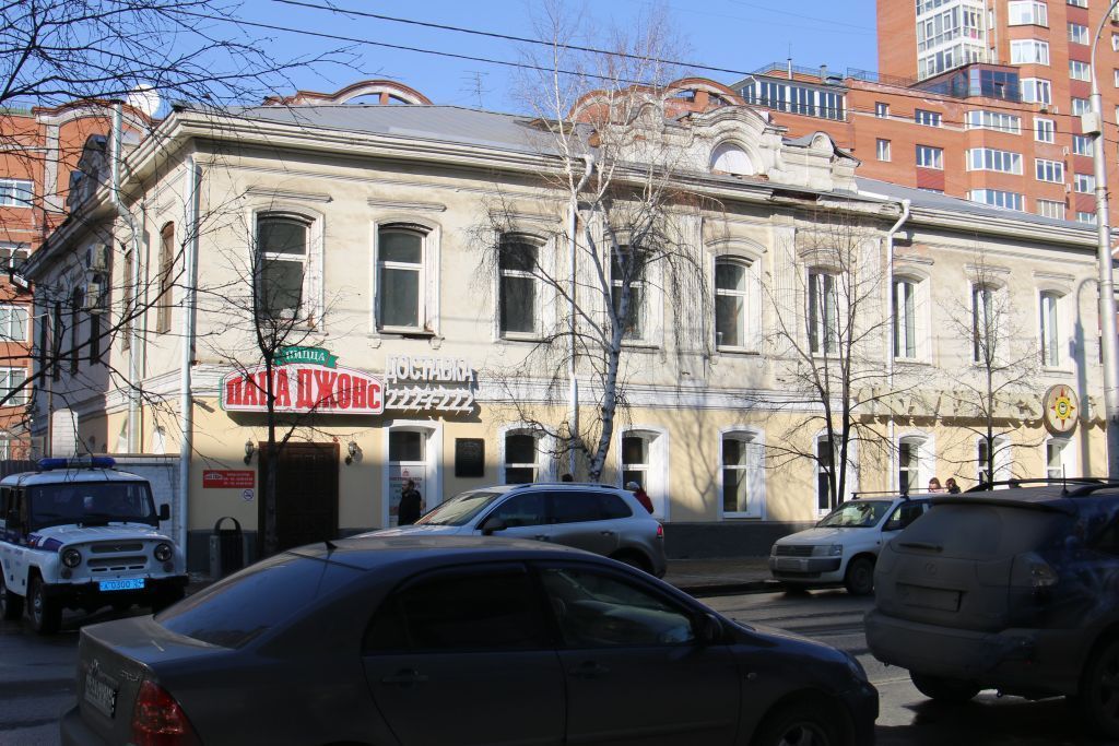 1. Местоположение, роль и градостроительные характеристики зданияЗдание расположено в центральной части города Красноярска, является частью историко-архитектурной среды главной улицы центра города – проспекта Мира.2. Объёмно-пространственная композиция зданияДвухэтажное с подвалом кирпичное здание, Г-образное в плане. К восточному фасаду примыкает лестничная пристройка с галереей на втором этаже. Главный вход находится на южном фасаде. Крыша четырёхскатная вальмовая. Главный южный фасад в девять осей оконных проёмов на втором этаже и восемь осей оконных проёмов с одним дверным проёмом (на крайней к западу оси) на первом этаже. Центральная слегка выступающая трёхосная часть фасада завершена фигурным аттиком с полуциркульным проёмом.Западный фасад в шесть осей оконных проёмов (включая заложенные) на втором этаже и в пять осей оконных проёмов с одним дверным проёмом (на крайней к северу оси) на первом этаже. Центральная часть фасада завершена фигурным аттиком с полуциркульным проёмом. Северный фасад в восемь осей оконных проёмов на втором этаже с одним дверным (на крайней к западу оси) проёмом и в восемь осей (включая заложенные) на первом этаже с одним дверным проёмом (на крайней к востоку оси).Восточный фасад в одну оконную ось на каждом этаже. Центральная часть фасада завершена фигурным аттиком с полуциркульным проёмом. К стене первого этажа примыкают три контрфорса.3. Внутренняя планировка зданияПланировочную структуру первого и второго этажей образуют две капитальные продольные стены, разделяющие здание на три неравные части, в которых три поперечные капитальные стены вычленяют комнаты различной площади. На первом этаже в средней части выделено квадратное помещение кладовой – «сейфа».4. Условия зрительного восприятия зданияРаскрытие здания и его восприятие – с юго-западной, южной и юго-восточной сторон с пр. Мира.5. Колористическое решение зданияЖёлтый цвет стен и белый цвет декоративных деталей. Цвет цоколя – серый. Цвет кровли – зелёный.6. Южный фасад6.1. Композиция фасада на первую половину ХIХ в.:симметричный фасад в девять осей;средняя часть фасада выделена слабым трёхосным ризалитом и возвышающимся над ним фигурным аттиком с полуциркульным проёмом; на втором этаже по краям ризалита и между его окон – широкие лопатки; окна второго этажа имеют большую высоту, чем окна первого этажа.6.2. Декоративное оформление фасада на первую половину ХIХ в.:рамочные профилированные обрамления лучковых оконных проёмов первого и второго этажей;прямоугольные слегка профилированные сандрики над окнами второго этажа;плоские каннелированные лопатки центрального ризалита;фигурный аттик в виде горизонтальной кирпичной стены с омегообразным подвышением и расположенными по его сторонам полукруглыми фронтончиками;венчающий мелкопрофилированный карниз;междуэтажный широкий карниз в виде двух горизонтальных мелкопрофилированных тяг с заключённым между ними плоским поясом.7. Западный фасад7.1. Композиция фасада на первую половину ХIХ в.:симметричный фасад в шесть осей; над средней частью фасада возвышается фигурный аттик с полуциркульным проёмом; окна второго этажа имеют большую высоту, чем окна первого этажа.7.2. Декоративное оформление фасада на первую половину ХIХ в.:фигурный аттик в виде горизонтальной кирпичной стены с о