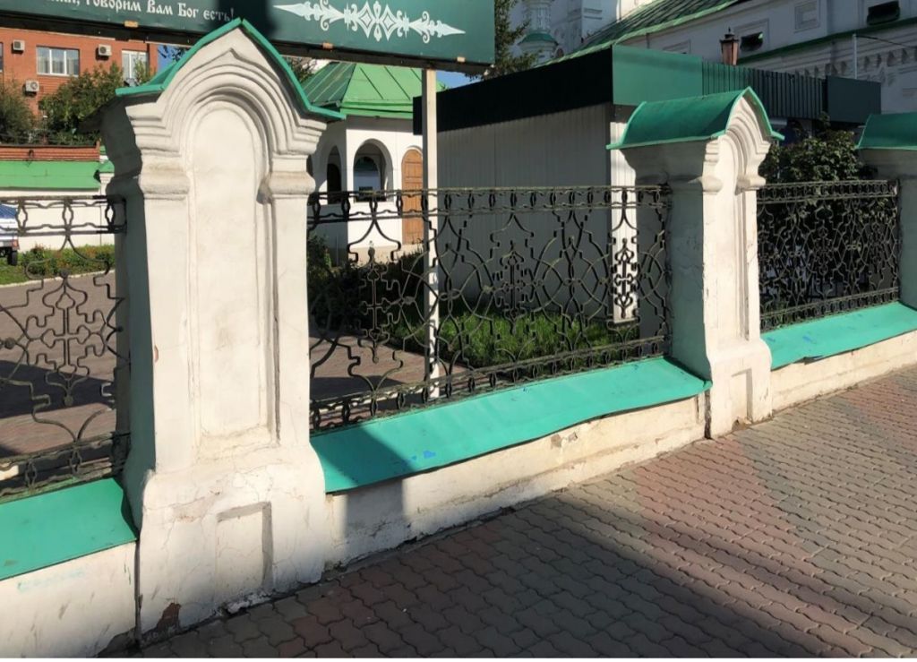 1. МестоположениеОграждение охватывает по периметру территорию Покровской церкви. 2. Габариты, техника и материал сооружения2.1. Каменная оградаГлухая стена толщиной в 2 кирпича под металлической кровелькой, имеет утолщения – пилястры, оформленные как столбики под отдельными кровельками. 2.2. Кованая оградаКирпичные столбы ограды с фигурным завершением и металлической кровелькой. Квадратные в сечении столбы с филенками завершены кокошниками, в верхней части оформлены раскрепованными валиками, в центре баз столбов – небольшие прямоугольные нишки. Между столбами – ажурные кованые решетки по кирпичному основанию (цоколю) с металлическим покрытием. Кирпичный цоколь со стороны улицы оформлен филенкой. Высота ажурных кованых решеток ограды – до низа валиков. 3. Конструктивные особенности, составные части сооруженияНа северной стороне – глухая кирпичная ограда 1826 г. от северо-западного угла в восточном направлении составляет участок в 7 прясел, далее поворачивает к югу участком в 3 прясла, затем поворачивает к востоку участком в 3 прясла.По восточной стороне – глухая каменная ограда.Южная сторона ограды сформирована преимущественно звеньями ажурной ограды 1870-х гг.: на южном участке ограды 7 ажурных прясел с запада и 3 глухих с востока.По западной стороне ограды от северо-западного угла территории комплекса в южном направлении расположены: двухстворчатые ворота, 4 прясла ажурной ограды, двухстворчатые ворота, калитка, далее линию ограждения продолжает западный фасад церкви, калитка, двухстворчатые ворота и одно прясло ажурной ограды.4. Особенности обработки поверхности и декораКирпичные элементы ограды оштукатурены и окрашены. Столбы кованой ограды оформлены с уличной стороны филенками и профилированными карнизиками, в верхней части столбов крестообразные розетки. Гладкое поле филенчатой поверхности столбов окрашено в тон. Кованые решетки изготовлены из полосы 3 х 0,6 см в сечении и окрашены. Сложный узор из двух чередующихся элементов орнамента включает изображения крестов и фигурных квадрифолий. По декору участки ажурной ограды с уличной стороны оформлены в стиле барокко. 5. Художественная ценность:важный элемент комплекса Покровской церкви;обеспечивает целостность восприятия ансамбля.