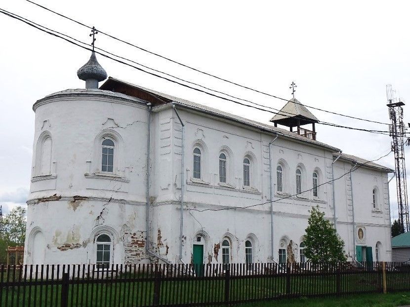 1. Градостроительные характеристики1.1. Местоположение объекта в системе застройкиРасположен в центре административной площади поселка, северным фасадом обращен к улице Московская.1.2. Композиционная значимостьЗдание является важным элементом панорамы поселка, его высотной доминантой.1.3. Секторы и направления видовых раскрытий, визуальные связи памятникаРаскрывается со стороны подъезда к поселку по улице Московская.2. Архитектурные и конструктивные характеристики2.1. Объемно-пространственная композиция на 1860 г.Каменная двухэтажная церковь. Здание церкви имеет в плане продольно-осевую структуру – последовательно расположенные на оси восток-запад объемы: бесстолпный четверик храма с полукруглой апсидой, трапезная, четырехярусная колокольня с притвором. Храмовый четверик перекрыт куполом (утрачен), который завершается многоярусным пятиглавием. Церковь имеет семь глав (утрачены): одну большую над куполом храма, шесть глав меньшего одинакового размера – четыре на диагональных щипцах храма и по одной главе на апсиде и колокольне. Главы выполнены в виде двух глухих барабанов, убывающих вверх по высоте и ширине, завершенных позолоченными луковичными главками с крестами. Высота первого и второго этажей церкви одинаковая, храмовая часть второго этажа – в два яруса (верхний ярус, завершенный щипцами с люкарнами, утрачен). Четырехъярусная колокольня представляет собой традиционный восьмерик на четверике, четверик и восьмерик двухъярусные (восьмерик утрачен). На южной грани третьего яруса колокольни имеется проем для освещения лестницы, ведущей к ярусу звона, перекрытому куполом с главкой. Габариты церкви – 28,0 х 7,0 м.2.2. Конструкция крыши на 1860 г.Храмовый четверик и колокольня завершены сомкнутыми восьмигранными куполами, апсида полукуполом. Крыши трапезной и притвора двускатные по деревянным стропилам. 2.3. Композиция и архитектурно-художественное оформление фасадов на 1860 г.2.3.1. Западный фасад на 1860 г.Композиция западного фасадаЗападный фасад притвора решен в одну ось в уровне первого и второго этажей (проем на первом этаже заложен).Декоративное оформление западного фасада:угловые лопатки с квадрифолийными и сложного рисунка филенками;профилированный междуэтажный пояс в виде карниза;профилированные наружные откосы окна;наличник окна в виде картуша, опирающегося на стилизованные пилястры (частично утрачен);подоконная полочка, украшенная сухариками;прямоугольная подоконная филенка.2.3.2. Южный и северный фасады на 1860 г.Композиция южного и северного фасадовФасады объемов храма и трапезной решены в три оконных оси каждый, притвор решен в одну оконную ось на первом этаже и в две оконных оси на втором этаже.Декоративное оформление южного и северного фасадов:угловые лопатки с квадрифолийными филенками (на первом этаже филенки утрачены); профилированный междуэтажный пояс в виде карниза;профилированные наружные откосы окон;наличники окон в виде картушей, опирающихся на стилизованные пилястры (на первом этаже утрачены полностью, на втором – частично);подоконные полочки, украшенные сухариками (на первом этаже утрачены);прямоугольные подоконные филенки (на первом этаже утрачены).2.3.3. Восточный фасад на 1860 г.Композиция восточного фасадаВосточный фасад двухъярусной алтарной апсиды решен в три оси оконных проемов (окна по ц