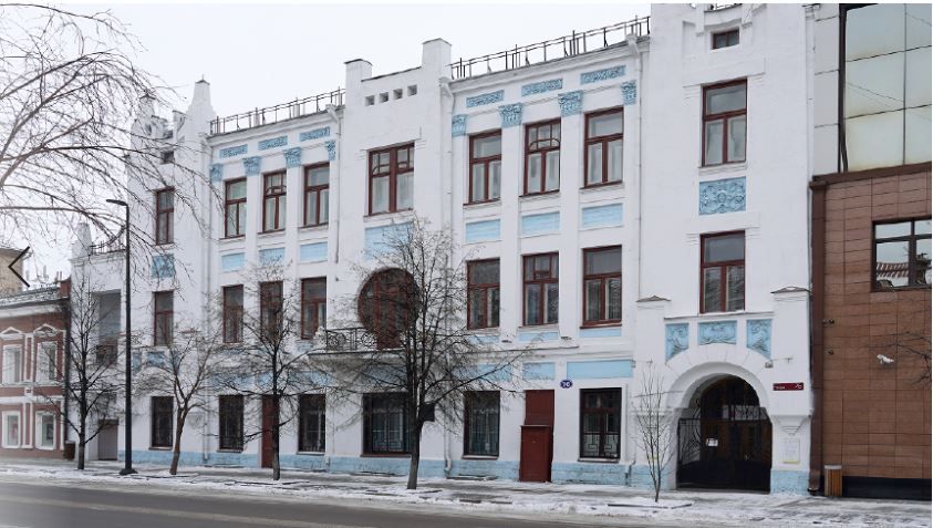1. Местоположение, роль и градостроительные характеристики зданияЗдание находится в историческом центре города, на северной сторонепр. Мира. Южным фасадом здание выходит на красную линию застройки проспекта Мира и формирует её вместе со зданиями, примыкающими к его глухим торцам.2. Объёмно-пространственная композиция здания на нач. ХХ в.Каменный трёхэтажный дом сформирован основным объёмом, прямоугольным в плане, и узкой пристройкой, примыкающей к нему с севера.Западная пристройка с главным входом и лоджией второго этажа возведена в более поздний период.В восточном ризалите находится арочный проезд во двор здания (в настоящее время переоборудован в помещение).Расположение парадной двухмаршевой лестницы соответствует западному ризалиту главного фасада, «чёрная» лестница находится в северо-восточной части здания и обозначена небольшим прямоугольным выступом лестничной площадки во двор.Глухой восточный торец основного объёма здания увенчан пологим треугольным щипцом. Подобный ему щипец западного фасада переходит в парапет северной пристройки. На первом и втором этажах южной части основного объёма здания выделяется крупное прямоугольное помещение, за которым с окнами, выходящими во двор, на первом этаже находится вестибюль с гардеробом, а на втором крупный холл. Три помещения северной пристройки на всех этажах связаны друг с другом анфиладно. На третьем этаже основного объёма здания помещения южной и северной его частей разделены коридором.Оштукатуренное поле стен главного фасада и его детали окрашены. Оконные переплёты внешних рам и полотна входных дверей окрашены в красно-коричневый цвет. Цоколь выполнен из гранитных плит. Кровля, кованые детали фасадов и металлические кровельки фасадов окрашены в красно-коричневый цвет (сурик железный). Внутренние оконные рамы и полотна дверей внутренних помещений окрашены в белый цвет.3. Восточный фасад3.1. Композиция восточного фасада на нач. ХХ в.Решён в 6 оконных осей дворовой части, сгруппированных попарно.Глухой торец основного объёма увенчан пологим треугольным щипцом.Форма, местоположение и размер оконных проёмов.3.2. Декор восточного фасада на нач. ХХ в.Окна первого этажа с лучковыми завершениями, с зубцовыми подоконными карнизиками.Окна второго и третьего этажей прямоугольные.Венчающий трёхступенчатый карниз небольшого выноса.4. Южный фасад4.1. Композиция южного фасада на нач. ХХ в.Симметричный, решён в 9 оконных осей.Три одноосных ризалита.На втором этаже в среднем ризалите расположено большое круглое окно и балкон.Форма, местоположение и размер оконных проёмов.4.2. Декор южного фасада на нач. ХХ в.Ризалиты выполнены в форме стилизованных пилонов, слегка сужаются кверху, возвышаются над карнизом и завершены парами массивных тумб с металлической решёткой.Тумбы боковых ризалитов имеют форму обелисков и увенчаны небольшими шарами.Более высокие боковые ризалиты имеют вогнутые седловидные завершения между тумбами, выполненными в форме обелисков.На среднем ризалите в уровне карниза расположен ряд квадратных ниш.Над арками сводчатого проезда (в правом ризалите) и бывшего парадного входа (в левом ризалите) на профилированных кронштейнах расположены элементы в виде усечённых пилонов с крупными арками-нишами в основании.Между окнами второго и третьего этажей боковых