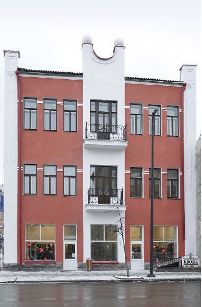 1.Местоположение, роль и градостроительные характеристики здания Здание расположено в историческом центре города, в границах квартала, образованного пересечением пр. Мира – ул. Сурикова – ул. Карла Маркса – ул. Вейнбаума. Северным фасадом выходит на красную линию настройки пр. Мира, восточным фасадом примыкает к пониженному объёму комплекса зданий торгового дома Смирновых.2.Объёмно-пространственная композиция_ здания на нач. XX в.Компактное трёхэтажное кирпичное здание с подвалом, прямоугольное в плане, несколько вытянутое в глубину усадьбы.Подвал расположен под всем зданием.Боковые стены здания поднимаются пологими щипцами двухскатной крыши, а на уличном фасаде выступают в виде лопаток.Здание обращено северным фасадом в семь осей на пр. Мира и возвышается в ряду двухэтажной застройки участка, примыкающего к ул. Вейнбаума.Центральный ризалит главного фасада фланкируют два входа. Боковой (восточный) фасад и дворовый (южный) фасад – симметричны, решены в шесть осей.В плане две широтно расположенные внутренние стены, смещённые к югу, вычленяют помещение лестницы (с выходом на нее с востока) и короткий коридор. На первом этаже расположены торговые залы с отдельными входами.Оштукатуренное поле стен главного фасада окрашено в цвет кирпича, детали – в белый цвет.Кирпичные стены боковых и дворового фасадов выполнены лицевой кладкой.Оконные переплёты внешних рам окрашены в красно-коричневый цвет (сурик железный).Цоколь из гранитных плит.Кровля и металлические кровельки деталей фасадов окрашены в красно-коричневый цвет (сурик железный).3.Северный фасад3.1.Композиция северного фасада на нач. XX в.Северный фасад симметричный, решён в семь осей второго и третьего этажей, средние оси фасада имеют балконные двери. Первый этаж peшëн в пять осей с входными дверями по обеим сторонам от центральной оси.В одноосном ризалите располагаются балконы второго и третьего этажей с квадратными проёмами, имеющими в центральной части балконную дверь.По сторонам ризалита в верхних этажах размещено по три узких окна.На первом этаже между тремя крупными витринами расположены две одностворчатые двери в магазин.Форма, местоположение и размер оконных проемов.3.2.Декор сeвepнoгo фасада на нач. XX в.Ризалит завершён щипцом седловидного очертания, переходящим в высокие тумбы с массивными шарами на них.Под свесом крыши расположен небольшой карниз.На угловых лопатках расположен лепной декор – декоративные накладки на тумбы, узор из листьев и три узкие ленты, спускающиеся сверху вниз и заканчивающиеся небольшими кольцами на уровне второго этажа.Цоколь из каменных плит.Ограждение балконов выполнено металлической кованой решёткой геометрического орнамента.4.Западный фасад4.1.Композиция западного фасада, на нач. XX в. Фасад решён в шесть оконных oceй третьего этажа. Форма, местоположение и размер ниш.4.2.Декор западного фасада нa нач. XX в.Фасад зaвepшëн ступенчатым щипцом, который фланкируют две высокие тумбы.На втором этаже ниши лучкового завершения.5.Восточный фасад5.1.Композиция восточного фасада на нач. XX в. Фасад решён в шесть оконных осей.Форма, местоположение и размер оконных проёмов.5.2.Декор восточного фасада на нач. XX в.Фасад завершён ступенчатым щипцом, который фланкируют две высокие тумбы.Окна лучкового завершения. Цоколь, облицованный камнем. Филёнка в пло