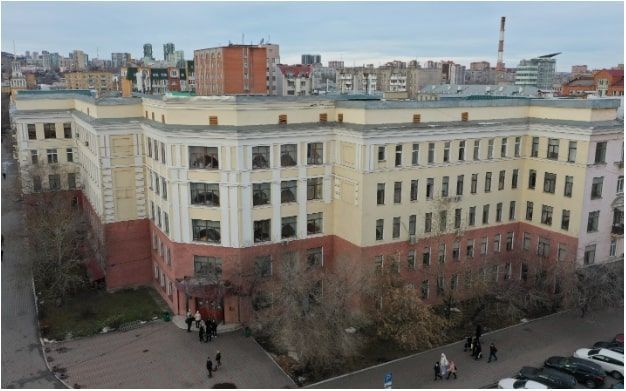 1. Местоположение, роль и градостроительные характеристики зданияКрупное угловое, состоящее из четырёх корпусов здание, входит в комплекс застройки «каменного квартала», южным фасадом обращено на ул. Карла Маркса, восточным – на ул. Декабристов, формирует юго-восточный угол перекрёстка.2. Объёмно-пространственная композиция здания на 1932–1937 гг.Пятиэтажное кирпичное здание с глухим парапетом вдоль уличных фасадов, состоит из четырёх блоков:первые два, прямоугольные в плане, главные фасады в 10 осей каждый, расположены вдоль ул. Карла Маркса со сдвигом относительно друг друга, под частью второго блока подвал;третий (центральный), шестиугольный в плане, в 7 осей главного фасада и 4 оси дворового фасада, расположен под углом 45 градусов к первым двум и четвёртому блоку;четвёртый, прямоугольный в плане, главный фасад в 11 осей, расположен вдоль улицы Декабристов под углом 90 градусов относительно первых двух блоков, последняя (11-я) ось блока сильно выдвинута вперёд, к её северному торцу примыкает соседнее здание, образуя симметричную архитектурную композицию. Вход в здание расположен по центральной оси 3-го (центрального) блока. Крыша вальмовая, сложной формы.3. Внутренняя планировкаПланировочная структура 1, 2, 4 блоков сквозная коридорная, непосредственно связана с центральным блоком. Трёхмаршевая центральная лестница, вестибюль и рекреации на каждом этаже расположены в центральном блоке. Двухмаршевая лестница расположена на 10 оси первого блока.4. Колористическое решениеОкраска фасада: первый и второй этажи окрашены в тёмно-коричневый цвет, последующие этажи – в светло-бежевый, архитектурные детали – в белый.5. Условия зрительного восприятияРаскрытие памятника и восприятие с улиц К. Маркса и Декабристов.6. Южный фасад6.1. Композиция южного фасада на 1932–1937 гг.Первый и второй блоки по 10 осей, центральный блок в три оси, четвёртый блок (северная часть) в 3 оси.Окна центрального блока, 10-й оси первого блока, средней оси четвёртого блока шире остальных.Сплошной глухой высокий парапет с квадратными слуховыми окнами, забранными решётками, завершён кирпичным профилированным поясом.Междуэтажное членение выполнено профилированными подоконными поясами под окнами 3, 4, 5 этажей. Над окнами 4-го этажа выполнен надоконный пояс.Углы выделены рустованными пилястрами от подоконного пояса 3-го этажа и до надоконного пояса 4-го этажа. Выше, в подоконном пространстве 5-го этажа, пилястры широкие плоские, ещё выше, в уровне 5-го этажа – сдвоенные, 10-я ось также выделена пилястрой в простенке.Углы центрального блока выделены широкими плоскими пилястрами от подоконного пояса 3-го этажа и до надоконного пояса 4-го этажа. Выше, в подоконном пространстве 5-го этажа, пилястры сдвоенные, ещё выше, в уровне 5-го этажа – сдвоенные со смещением от своей оси. Фасад 4-го блока (южная часть) в уровне 4, 5 этажей имеет ложные проёмы, ложный проём 4-го этажа обрамлён рустованными пилястрами, в уровне 5-го этажа – сдвоенными пилястрами.Цоколь выделен уступом.6.2. Декор южного фасада на 1932–1937 гг.Штукатурка под «шубу» первого и второго этажей.Единый широкий профилированный карниз среднего выноса с широким плоским фризом, выделенным уступом.7. Восточный фасад7.1. Композиция восточного фасада на 1932–1937 гг.Первый и центральный блок в 3 оси, 4-й блок в 11 осей.Сплошной глухой высокий парапет