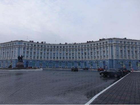 1. Градостроительные характеристики1.1. Местоположение объекта в системе городской застройкиОбъект расположен в центральной части г. Норильска, на Гвардейской площади. 1.2. Композиционная значимостьОбъект является частью архитектурного ансамбля Гвардейской площади, формирует северо-восточную часть ее границы. Главным фасадом центрального объема объект обращен на Гвардейскую площадь, восточным крылом – на ул. Пушкина, северо-западным крылом – на Ленинский проспект.1.3. Габариты и силуэтГабариты и высотные отметки объекта на дату строительства (1952 г.).1.4. Секторы и направления видовых раскрытий, визуальные связи объектаОбъект раскрывается с Ленинского проспекта при движении со стороны озера Долгого. 2. Архитектурные и конструктивные характеристики2.1. Объемно-пространственная композиция на 1952 г.Крупное 6-этажное здание, состоящее из трех объемов – центрального, дугообразного в плане, и боковых прямоугольных в плане крыльев. Центральный объем формирует северную треть застройки Гвардейской площади. Два боковых крыла выходят на Ленинский проспекта и ул. Пушкина. Под зданием выполнен подвал. Нижний ярус со стороны улицы двухсветный (соответствует по высоте двум стандартным этажам), остальные 4 надземных этажа (с 3-го по 6-ой) одинаковые по высоте, со стороны двора и торцов здания – 6 одинаковых по высоте этажей.2.2. Конструкция крыши Крыша вальмовая со слуховыми окнами. Кровля металлическая по деревянным стропилам и обрешетке. На уличных и торцевых фасадах по краю крыши устроена балюстрада, на стыке основного объема и боковых крыльев устроен парапет.2.3. Композиция и архитектурно-художественное оформление фасадов на 1952 г.2.3.1. Уличный фасад центрального объемаКомпозиция уличного фасада центрального объемаФасад симметричен относительно центральной оси, отличается богатой пластикой, решен в 27 осей оконных проемов с 3-го по 6-й этажи.Нижний ярус служит основанием колоннады, объединяющей три этажа, прорезан 13 крупными проемами с арочным завершением (на четных осях): крайние проемы дверные, все остальные – оконные. Три этажа (со 3-го по 5-й) объединяют 28 восьмигранных полуколонн стилизованного композитного ордера центральной колоннады. Между основаниями полуколонн расположены неглубокие портфенетры 3-го этажа в виде парапетов. На 5-ом этаже по нечетным осям между колоннами расположены портфенетры сложной формы (трехгранные, трапециевидные в плане). Углы центрального фасада ступенчатые в плане. Центральную колоннаду слева и справа фланкируют сдвоенные полуколонны, расположенные на вторых ступенях углов, повторяющие по оформлению полуколонны центральной колоннады.Нижний ярус отделен от верхних этажей карнизом. Над раскрепованным фризом с карнизом устроен аттиковый 6-й этаж в уровне антаблемента, завершенный карнизом. Между окнами 6-го этажа – столбцы, поддерживающие карниз. Оконные проемы этажей с 3-го по 6-й – прямоугольной формы. Декоративное оформление уличного фасада центрального объема:рустовка нижнего яруса; руст, имитирующий разгрузочные арки, над арочными проемами; филенчатые ниши под окнами нижнего яруса; полусферические ниши между окнами нижнего яруса в уровне арок;рустовка колонн; оформление портфенетров 3-го этажа балюстрадой в центральной части с глухими участками по краям, карнизными поясками по верхней и нижней 