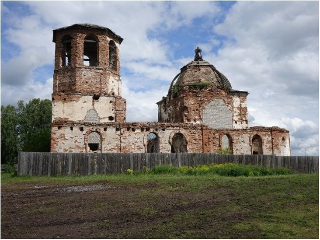 1. Градостроительные характеристики1.1. Местоположение объекта в системе застройкиЗдание расположено в южной части села на пересечении ул. Луговая и ул. Школьная. 1.2. Композиционная значимостьЗдание является важным элементом панорамы села, его высотной доминантой. 1.3. Габариты, силуэт на 1906 г.Здание сложной формы в плане, с габаритными размерами 25,4 х 17,7 м.1.4. Секторы и направления видовых раскрытий, визуальные связи памятника Объект раскрывается с ул. Школьная и с ул. Луговая. 2. Архитектурные и конструктивные характеристики2.1. Объемно-пространственная композиция на 1906 г.Одноэтажная церковь с трехчастной планировочной структурой. Основной объем здания – прямоугольный в плане двухсветный храмовый четверик с полукруглой алтарной апсидой. С западной стороны к храму примыкает прямоугольная в плане трапезная. С запада к трапезной примыкает трехъярусная колокольня, относящаяся к типу «восьмерик на четверике», с помещением притвора в нижнем ярусе. С севера и юга к храмовому четверику примыкают одноэтажные приделы с полукруглыми апсидами, вытянутые на всю длину здания. Вход в притвор главного храма расположен с западной стороны.2.2. Крыши (главы, завершения) на 1906 г.Крыши храма и колокольни куполообразные. Над апсидами главного и придельных храмов уплощенные полукупола. Над объемами трапезной и приделов общая двухскатная крыша. Над куполами храма и колокольни, а также над полукуполами алтарных апсид возвышаются главки, установленные на барабаны, в виде четырех соединенных крестообразно крупных деревянных элементов, имеющих плавно изогнутые очертания. Кровля металлическая, стропильная система и обрешетка деревянные. 2.3. Композиция и архитектурно-художественное оформление фасадов 2.3.1. Западный фасад на 1906 г.2.3.1.1. Композиция западного фасадаФасад решен в одну ось дверного проема в нижнем ярусе колокольни и в две оконных оси приделов. Дверной и оконные проемы имеют полуциркульные завершения.Грани яруса звона колокольни прорезаны проемами с полуциркульными завершениями.2.3.1.2. Декор западного фасада:простые лопатки на углах колокольни, приделов и храмового четверика;кирпичные карнизы простого очертания в завершении ярусов колокольни, приделов и храмового четверика;кирпичные карнизы простого очертания скатной крыши приделов;полуколонны, фланкирующие дверной проем;архивольт над дверным проемом;рамочные наличники окон приделов;пояс простого очертания по низу проемов яруса звона колокольни;деревянное ограждение в проемах яруса звона колокольни;трехчастное полуглавие храмового четверика;световая люкарна полуглавия храмового четверика.2.3.2. Северный и южный фасады на 1906 г.2.3.2.1. Композиция северного и южного фасадов Фасад придела решен в четыре оконных и одну дверную ось. Храмовой части соответствуют две оконных оси, трапезной – одна дверная и одна оконная ось, притвору – одна оконная ось.Фасад храмового четверика решен в две оси окон второго света.Все окна имеют полуциркульные завершения.2.3.2.2. Декор северного и южного фасадов:простые лопатки на углах объемов;кирпичные карнизы простого очертания в завершении приделов и храмового четверика;рамочные наличники окон приделов;рамочные наличники с волютами окон храмового четверика;трехчастное полуглавие храмового четверика;световая люкарна полуглавия храмового четверика.2.