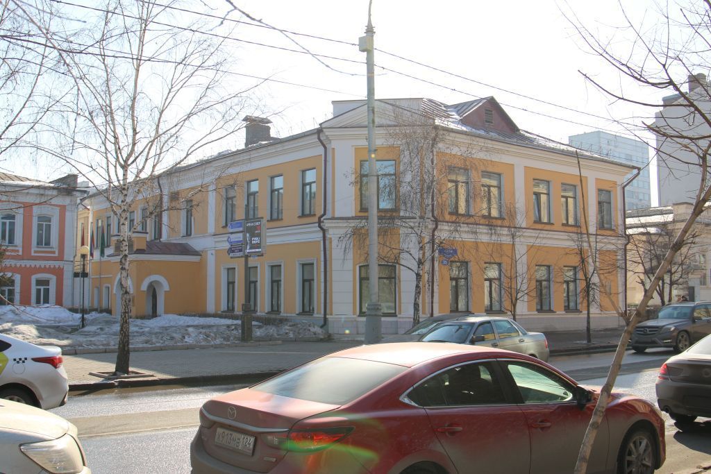 1. Местоположение, роль и градостроительные характеристики 1.1. Местоположение объекта в системе городской застройкиОбъект расположен в историческом центре города Красноярска на пр. Мира, в юго-западном углу перекрёстка пр. Мира и ул. Парижской Коммуны, по линии застройки пр. Мира, со значительным отступом от линии застройки ул. Парижской Коммуны. 1.2. Композиционная значимость Вместе с домом Гадалова Н.Г. формирует юго-западный угол перекрёстка пр. Мира и ул. Парижской Коммуны. 1.3. Габариты и силуэт Габариты и высотные отметки здания до конька кровли на кон. ХIХ в.1.4. Секторы и направления видовых раскрытий, визуальные связи объектаОбъект обращён восточным фасадом на ул. Парижской Коммуны, северным фасадом – на пр. Мира. Раскрытие памятника и восприятие с перекрёстка пр. Мира и ул. Парижской Коммуны, а также с территории прилегающего сквера.2. Архитектурные и конструктивные характеристики2.1. Объёмно-пространственная композиция на кон. ХIХ в.Двухэтажный дом, Г-образный в плане, с западающим юго-западным углом и ризалитом на скошенном северо-восточном углу.2.2. Конструкция крыши на кон. ХIХ в. Крыша вальмовая с железной кровлей под окраску, по деревянным стропилам и обрешётке. 2.3. Композиция и архитектурно-художественное оформление фасадов на кон. ХIХ в. 2.3.1. Северный фасад на кон. ХIХ в. Композиция фасада Композиционно фасад, решённый в пять осей, разбит широкими плоскими лопатками на три прясла: в крайнем западном прясле – одна ось (в уровне второго этажа), в остальных – по две. Углы фасада обработаны широкими плоскими лопатками. Перемычки окон прямые. Окна первого этажа опираются на подоконную тягу, раскрепованную по лопаткам. Междуэтажное членение выполнено профилированным карнизом и тягой, раскрепованными по лопаткам. Фасад завершён карнизом малого выноса с плоским фризом. Высокий цоколь с уступом раскрепован по лопаткам.Декоративное оформление фасада:рустованные лопатки в уровне первого этажа;профилированные подоконная тяга и межэтажный пояс;профилированный многообломный карниз;плоский фриз;цоколь, обработанный прямоугольным рустом.2.3.2. Восточный фасад на кон. ХIХ в.Композиция фасадаКомпозиционно фасад решён в одиннадцать осей и разбит широкими плоскими лопатками на три прясла: в южном прясле шесть осей, в северном – четыре, в центральном – одна. Углы фасада обработаны широкими плоскими лопатками. Перемычки окон прямые, перемычки окон первого этажа в южном прясле – лучковые. Окна первого этажа северного прясла опираются на подоконную тягу, раскрепованную по лопаткам. Междуэтажное членение в северном прясле выполнено профилированным карнизом и тягой, раскрепованными по лопаткам. Междуэтажное членение в южном и центральном пряслах выполнено профилированным тягами, раскрепованными по лопаткам. Фасад в северном прясле завершён многообломным карнизом небольшого выноса с плоским фризом. Фасад в южном и центральном пряслах завершён карнизом малого выноса с плоским фризом. Высокий цоколь с уступом раскрепован по лопаткам.Декоративное оформление фасада:рустованная северная угловая лопатка в уровне первого этажа;профилированные подоконная тяга и межэтажный карниз;профилированный многообломный карниз;плоский фриз;многообломный карниз с метрическим рядом кронштейнов в южном и центральном пряслах;цоколь, обработанный п