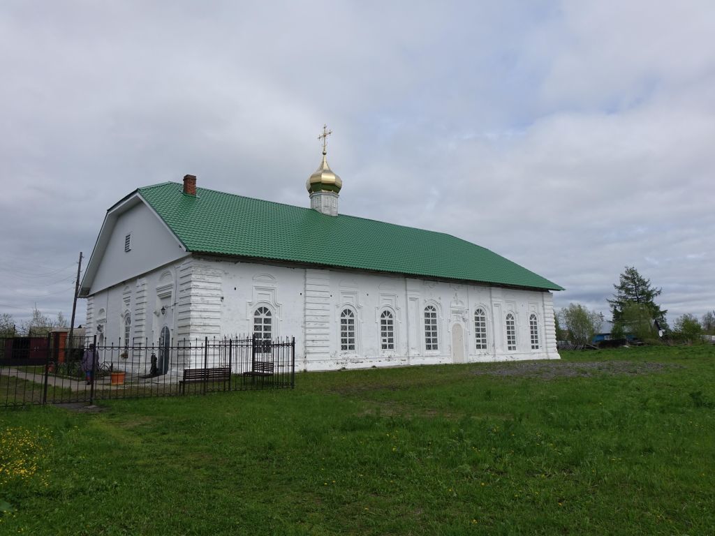 1.Местоположение, роль и градостроительные характеристики зданияЗдание церкви расположено при въезде в село, на крутом берегу Нижней Тунгуски, недалеко от места ее впадения в Енисей. Северным фасадом здание обращено на ул. Святого Луки Войно-Ясенецкого. Градостроительная доминанта села. 2. Условия зрительного восприятияЗдание церкви раскрывается в береговой панораме со стороны реки Нижняя Тунгуска и со стороны подъезда к нему по ул. Святого Луки Войно-Ясенецкого. 3. Объемно-пространственная и планировочная композиция здания на нач. XIX в.Здание церкви прямоугольное в плане, с традиционным для Сибири «кораблевым» типом объемно-пространственной композиции; имеет размеры в плане 27,0 х 16,0 м, по высоте храмовой части вместе с центральной главой и крестом – 23,9 м. Высота колокольни со шпилем и крестом – 31,0 м. С северной стороны от изначально возведенного холодного Троицкого предела (холодная церковь) расположен теплый придел в честь Богоявления Пресвятой Богородицы. Особенностью объемно-пространственной композиции является размещение между притворами холодной церкви и теплого придела помещения церковной ризницы, отчего столп колокольни оказался сдвинутым к югу от продольной оси холодного храма. Основной объем колокольни состоит из четверика и возвышающегося над ним восьмерика яруса звона, каждый из которых разбит на два яруса. К основному ядру здания – квадратному трехсветному четверику холодного храма примыкают помещения алтаря и трапезной, с западной стороны расположено квадратное в плане помещение притвора. Помещения теплых храма и трапезной пространственно слиты. На западном фасаде (две боковые оси) расположены входы в холодную церковь и теплый придел, оборудованные крыльцами-папертями с деревянными ступенями и деревянными сквозными перилами и имеющие навесы. По осям холодного и теплого храмов также расположены входы с крыльцами.4. Крыши (главы, завершения) на нач. XIX в.Колокольня завершена восьмигранным изогнутым куполом с массивным фигурным барочным шпилем на глухом восьмигранном барабане, шпиль увенчан крестом на яблоке.Углы и восьмигранный изогнутый купол храмового четверика, скатная крыша совмещенного объема алтарных апсид холодной и теплой церквей завершены вытянутыми восьмигранными барабанами с главками и крестами на яблоках. Центральный барабан храмовой части прорезан по южной, северной, восточной и западной граням арочными проемами света.Все стены (грани) четверика и яруса звона колокольни, объема храма, световые грани центрального барабана храмового четверика завершены лучковыми полуглавиями. Теплые храм, трапезная, притвор с церковной ризницей покрыты односкатной крышей, которая сходится в одном коньке с односкатной крышей трапезной холодной церкви. 5. Композиционное решение фасадов, включая расположение и форму оконных проемов, систему горизонтальных и вертикальных членений стен Композиция фасадов подчинена принципу симметрии (за исключением западного фасада теплого придела) – расположение проемов ориентировано симметрично относительно центральной оси каждого отдельного объема (прясла). Верхний ярус восьмерика (ярус звона) колокольни прорезан по граням арочными проемами, отделен от нижнего яруса профилированной тягой. Верхний ярус четверика колокольни имеет на оси южной грани кругл